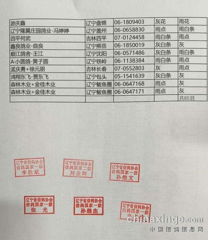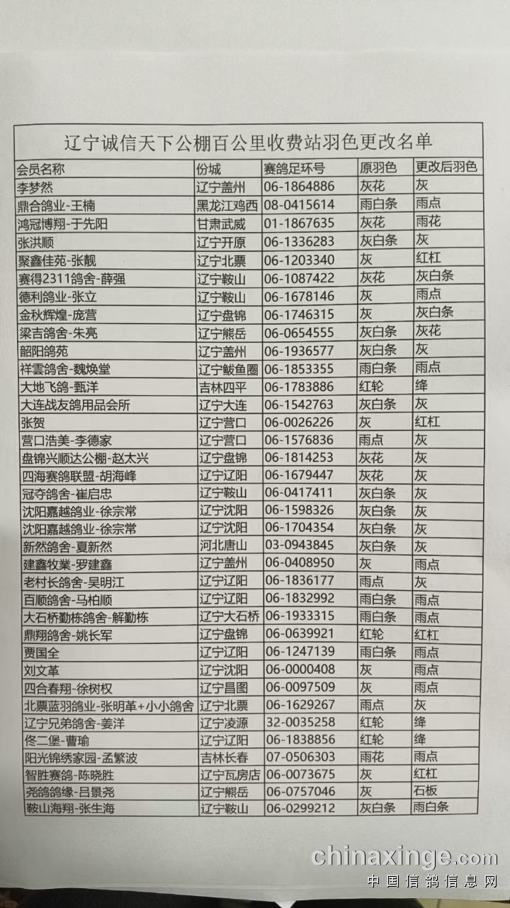 辽宁诚信天下公棚逐羽扫描羽色更改名单