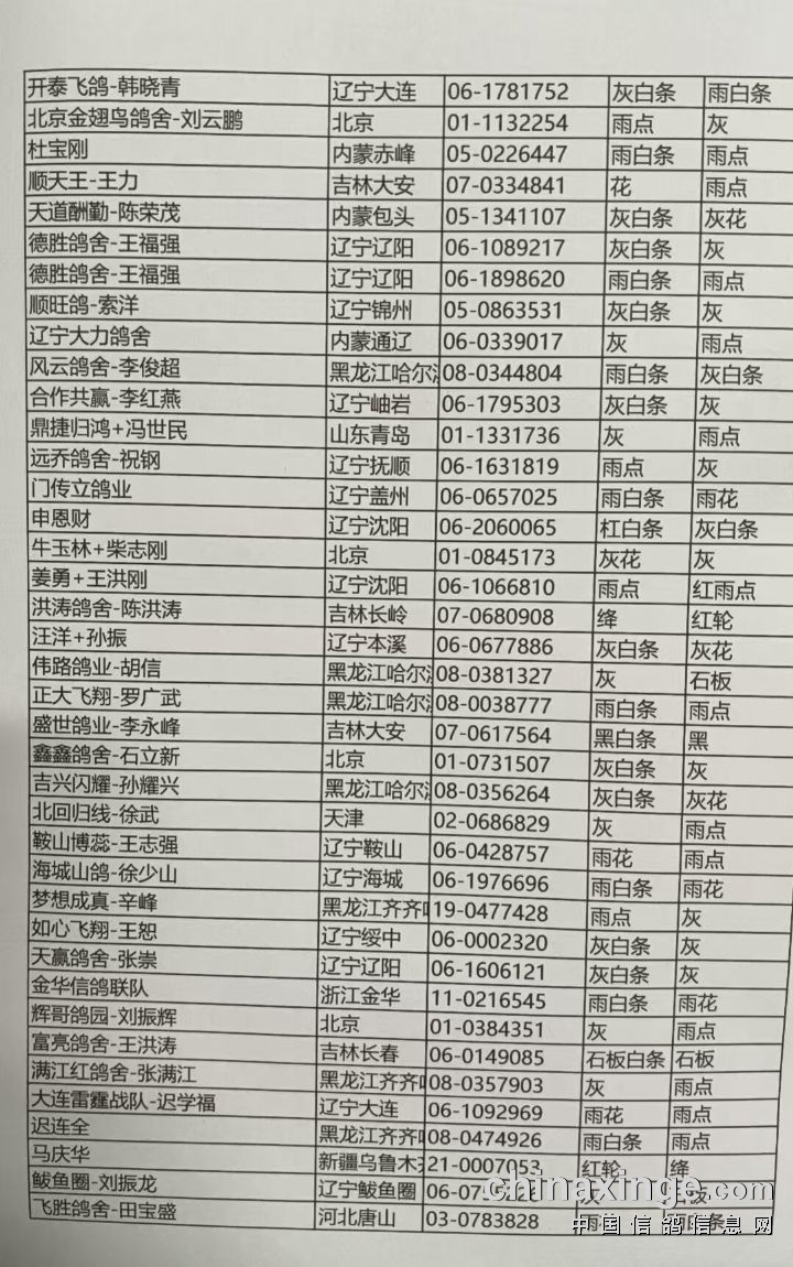 辽宁诚信天下公棚100公里收费站三日归巢名单