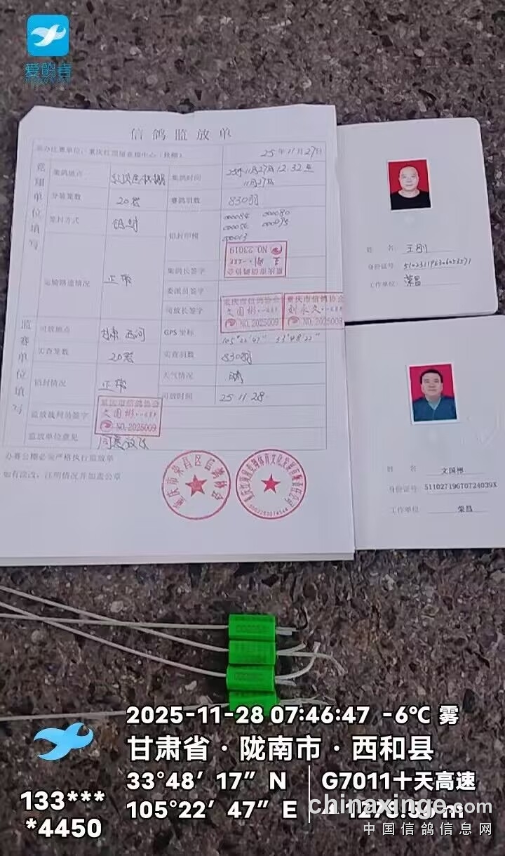 重庆红顶屋竞翔中心(秋)25年第四关比赛于今晨07:56在甘肃省陇南市西河服务区放出,司放地经度105°22′47″,北纬33°48′17″,实测483空距,鸽群走势良好,在线直播与短信同步(由于短信是由第三方平台提供服务,短信发送有约3%的失败率,以网站上的实时在线扫描数据为准),请广大会员相互转告!谢谢。