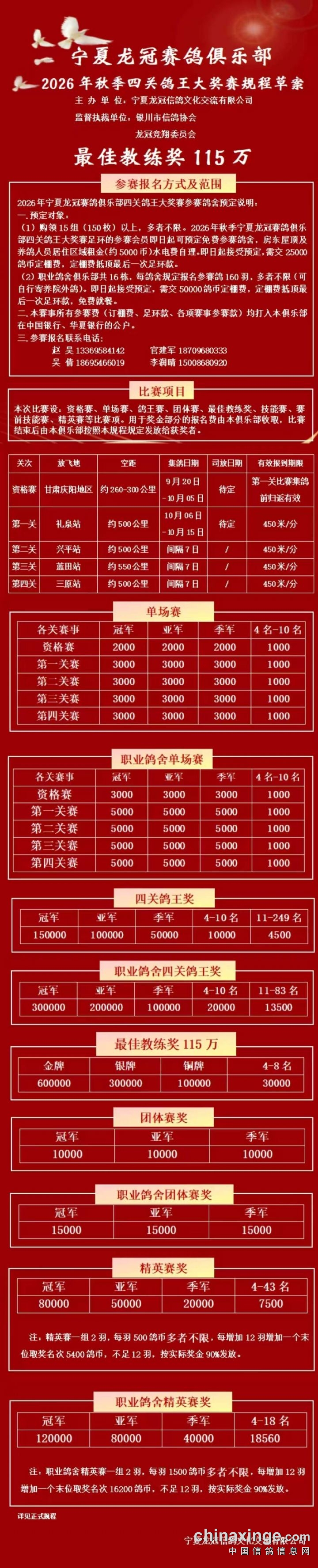 2026年宁夏龙冠赛鸽俱乐部秋季四关鸽王大奖赛竞赛规程(草案)
