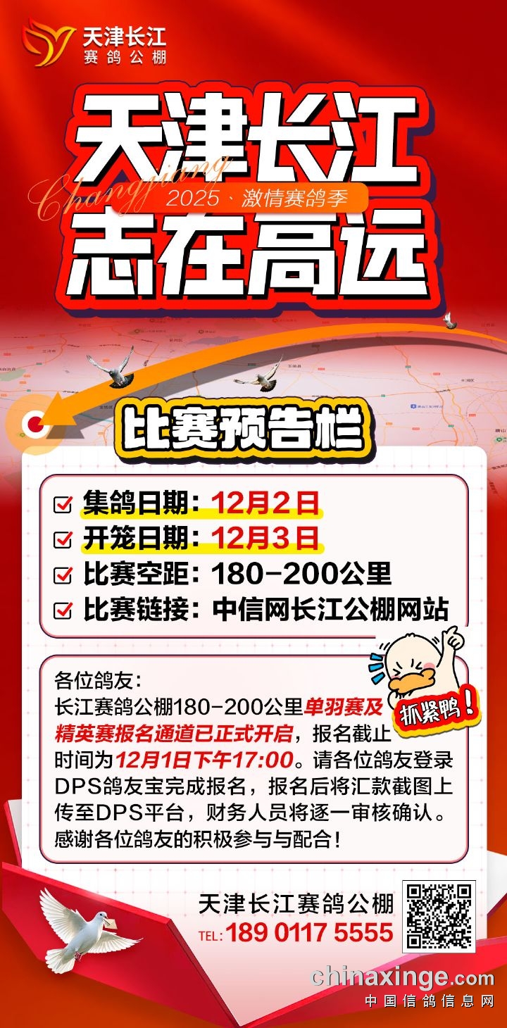 天津长江赛鸽公棚180-200公里热身赛集鸽公告及比赛通知