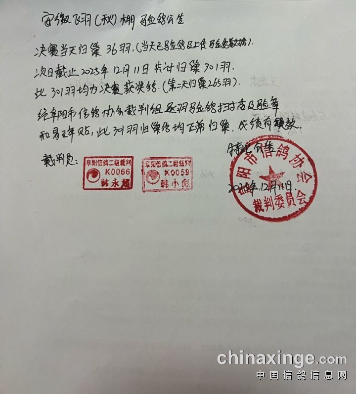安徽飞羽公棚(秋):当天归巢验鸽清单