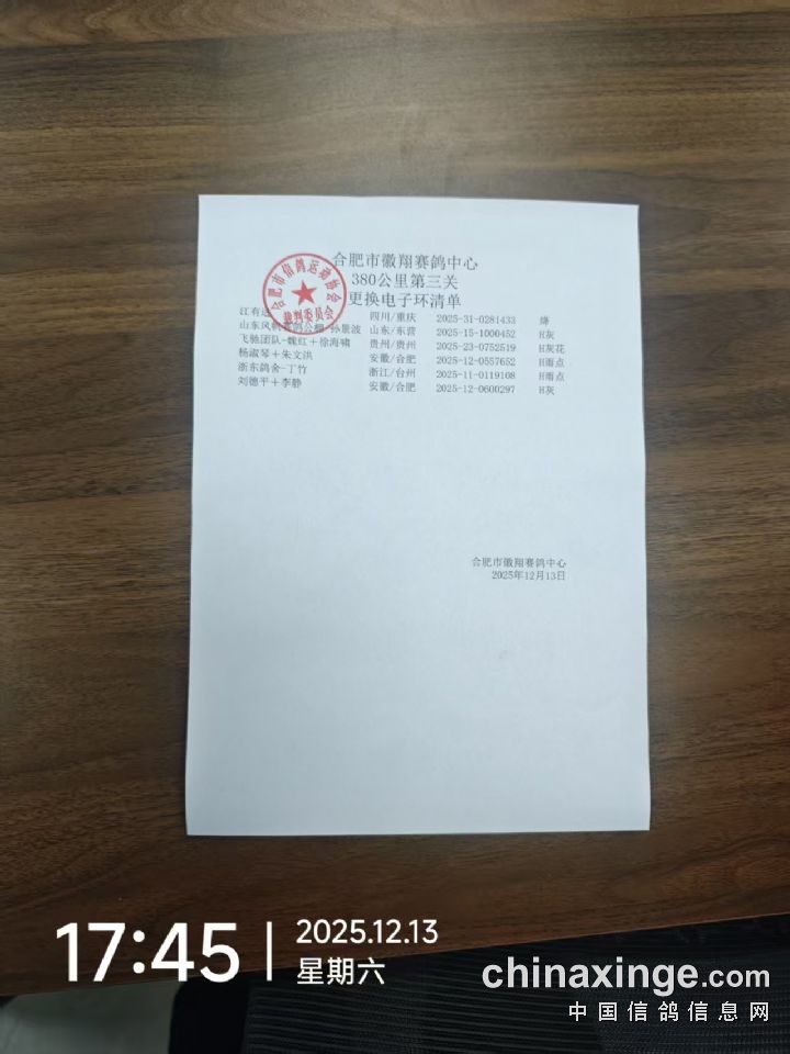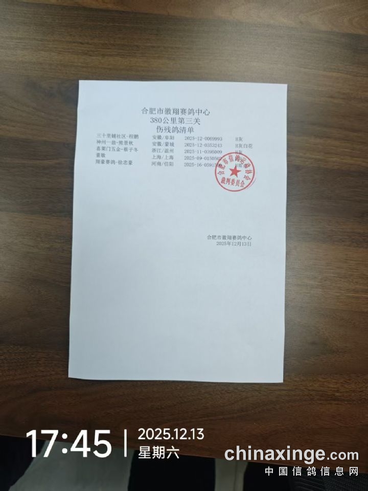 合肥市徽翔赛鸽中心380-400公里第三关比赛公告