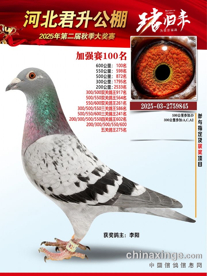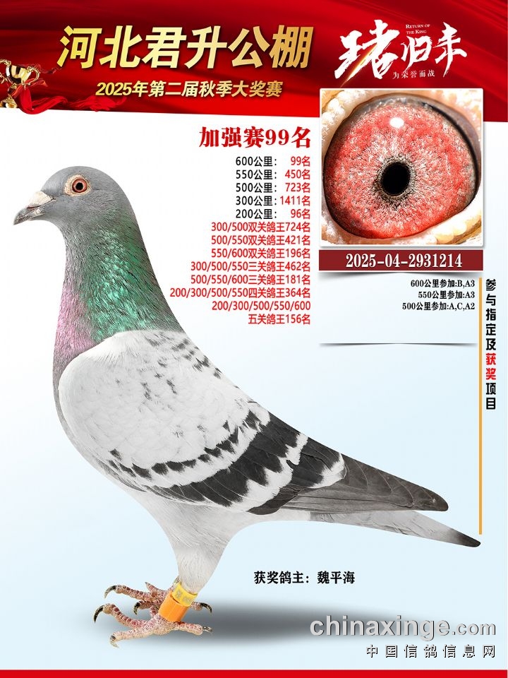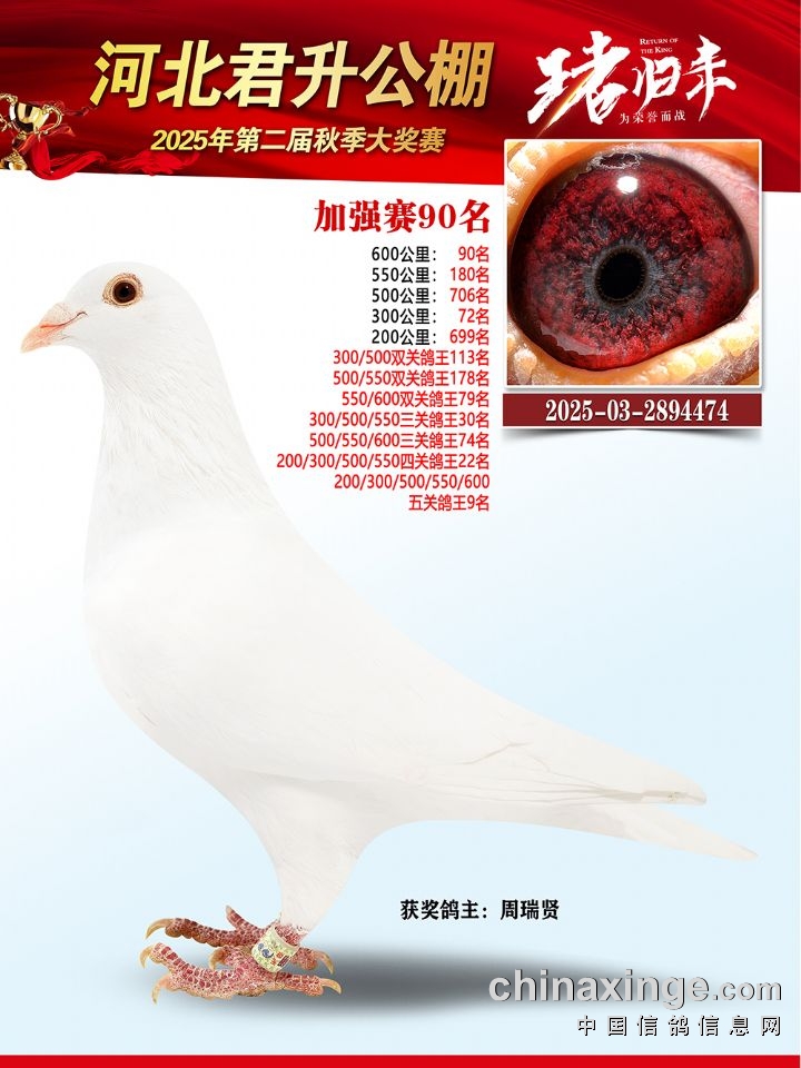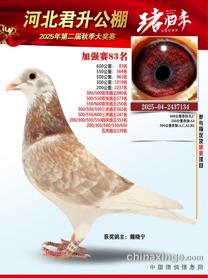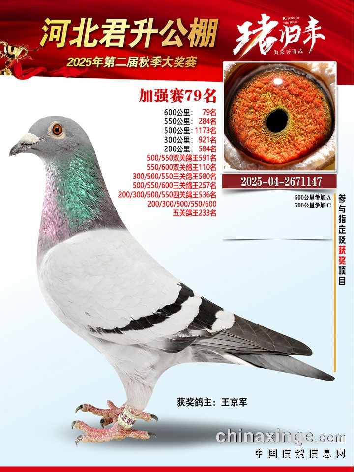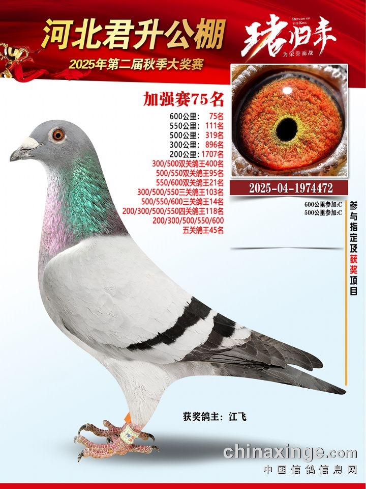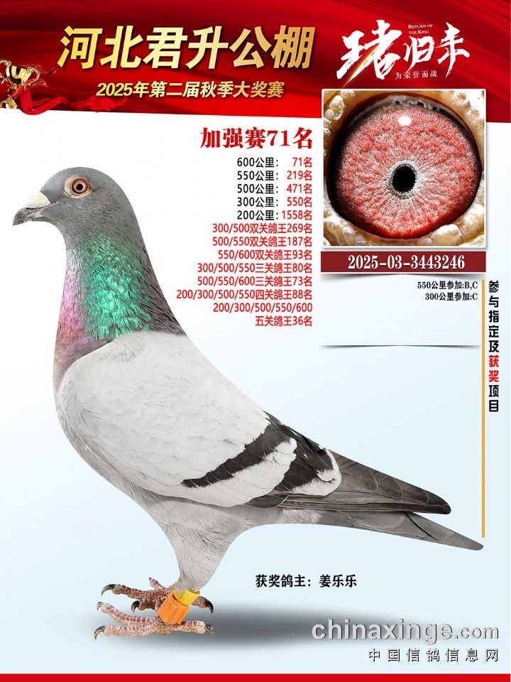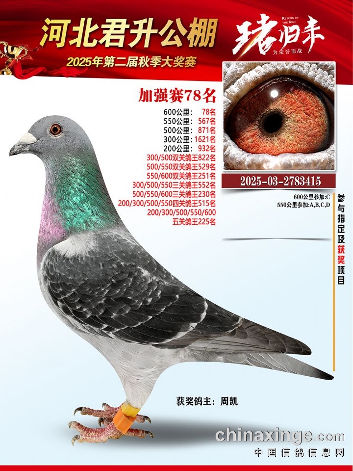 河北君升公棚秋赛550公里加站赛冠军-10名获奖鸽照片
