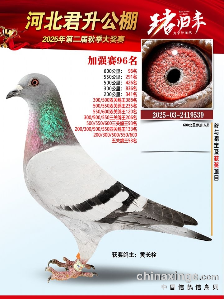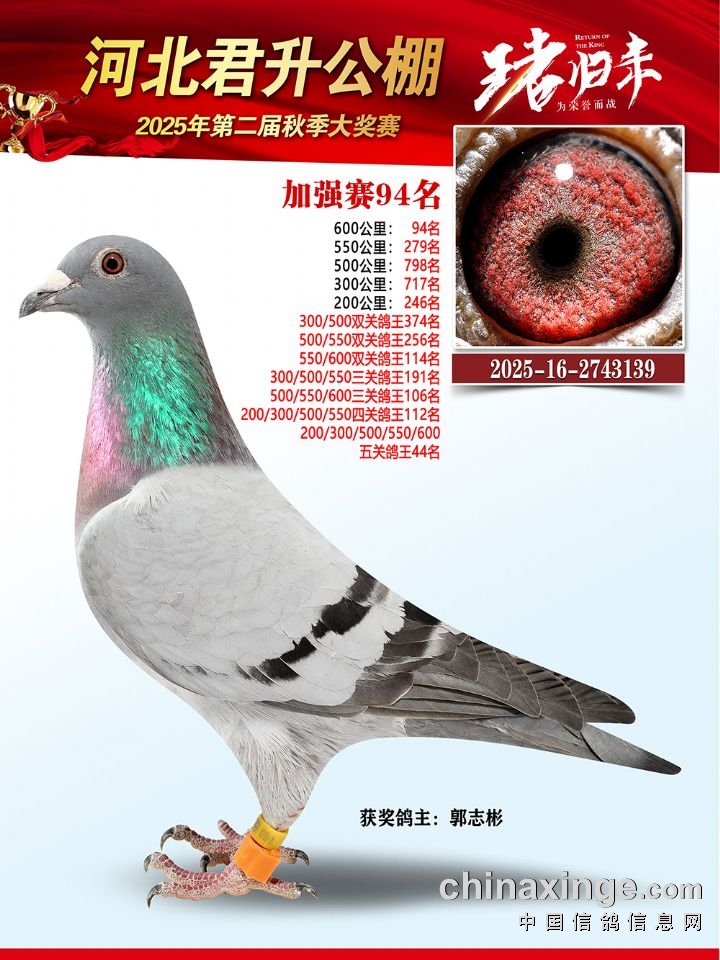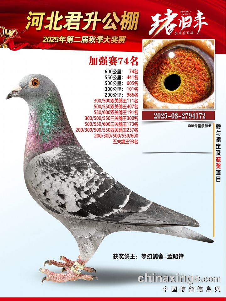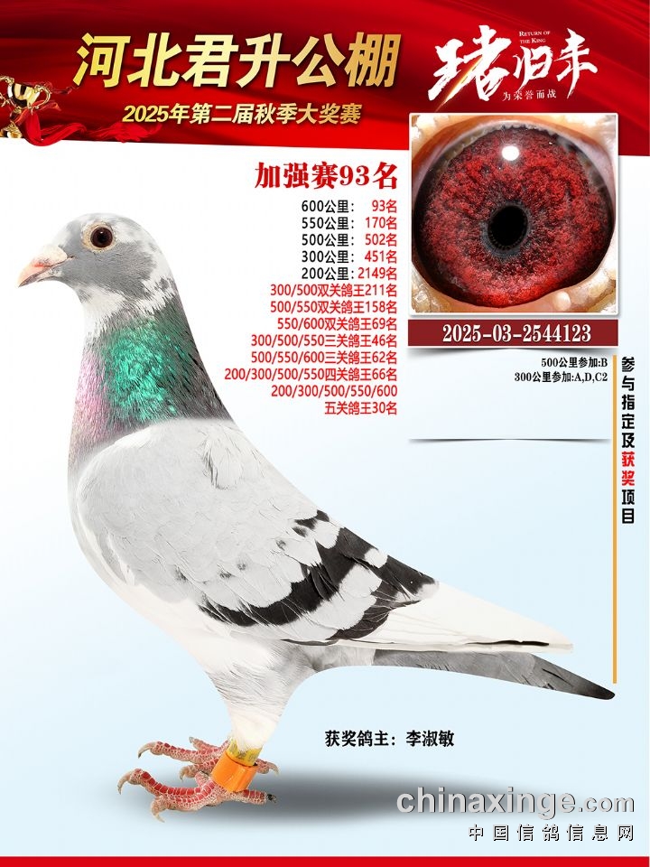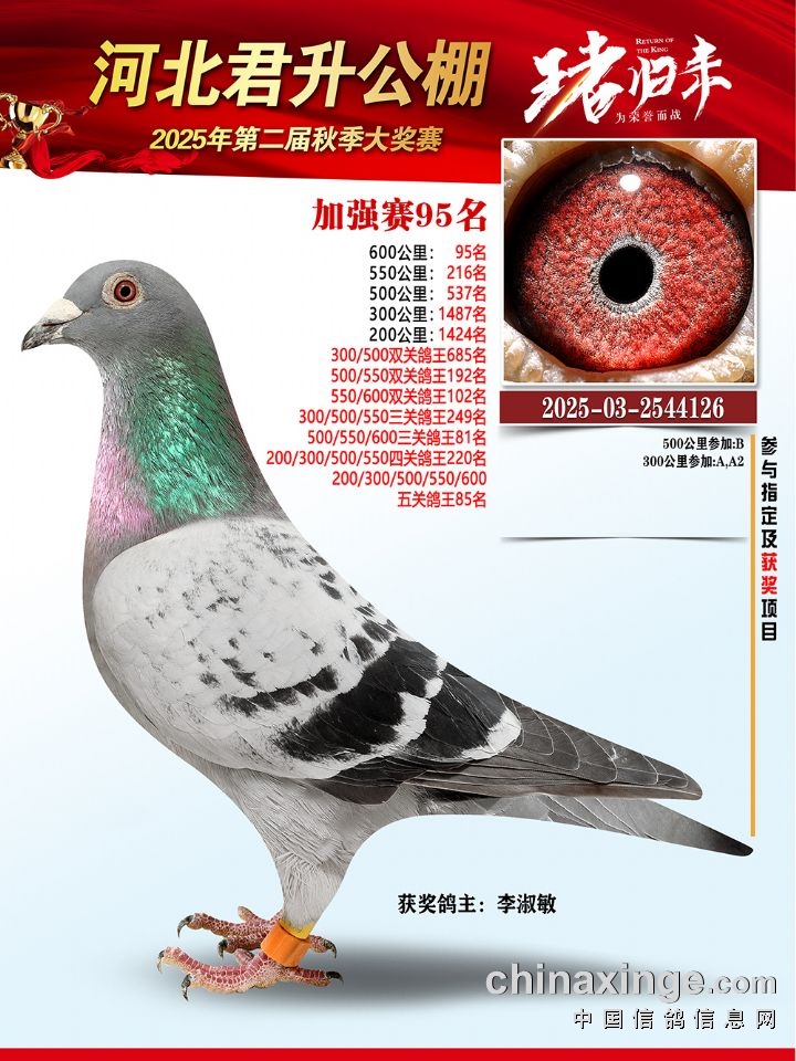 河北君升公棚秋赛600公里加强赛冠军-10名获奖鸽照片