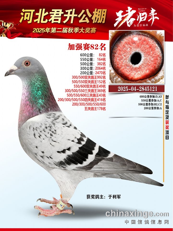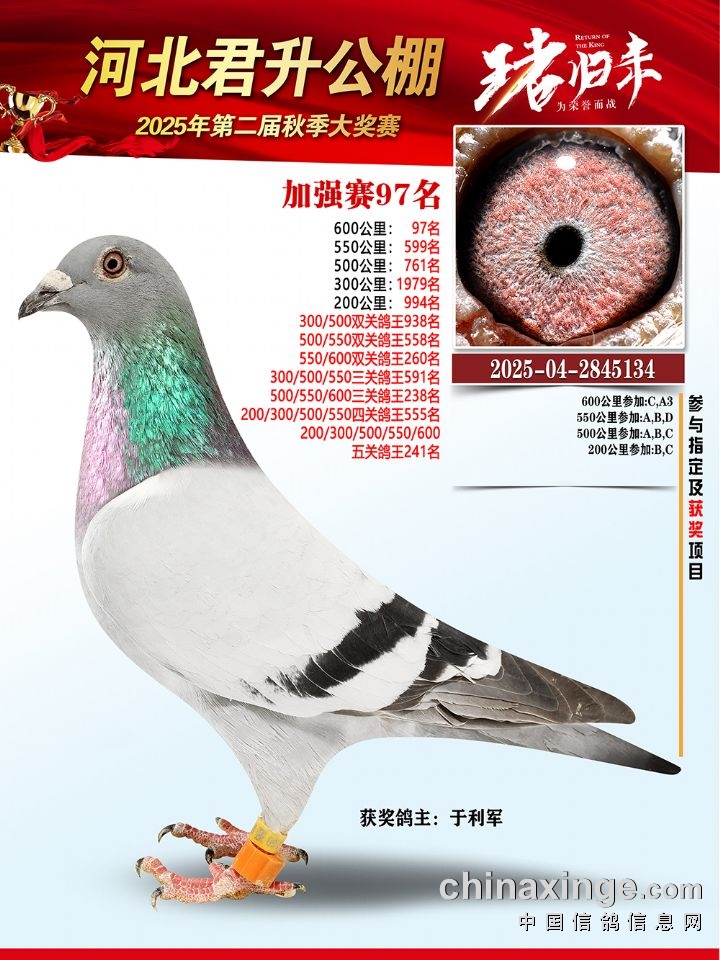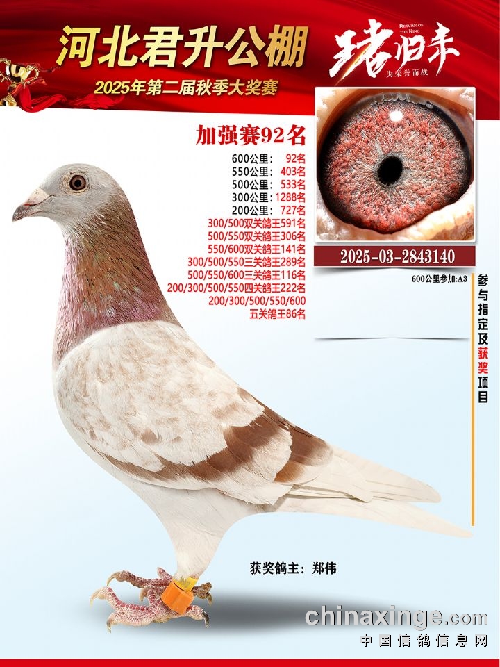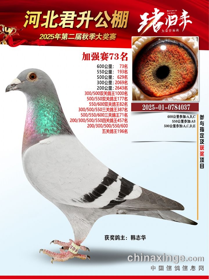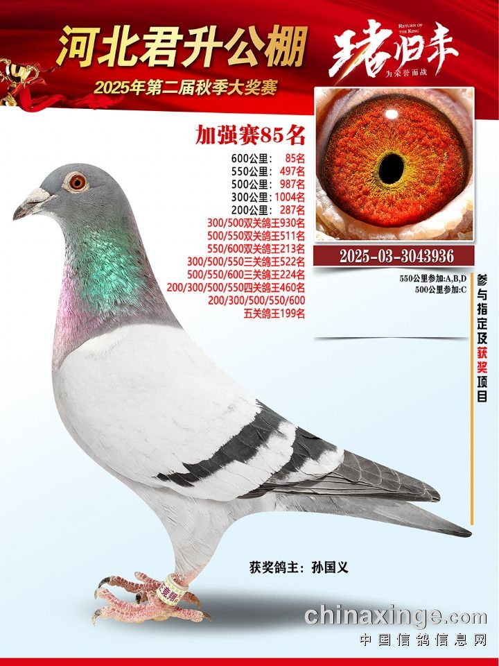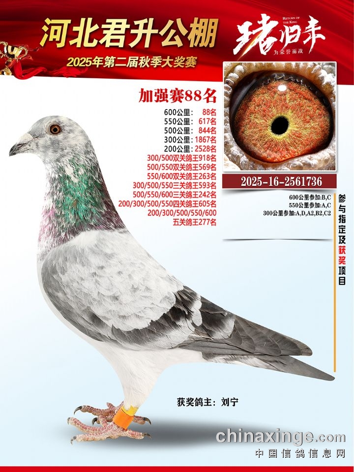 河北君升公棚秋赛600公里加强赛冠军-10名获奖鸽照片