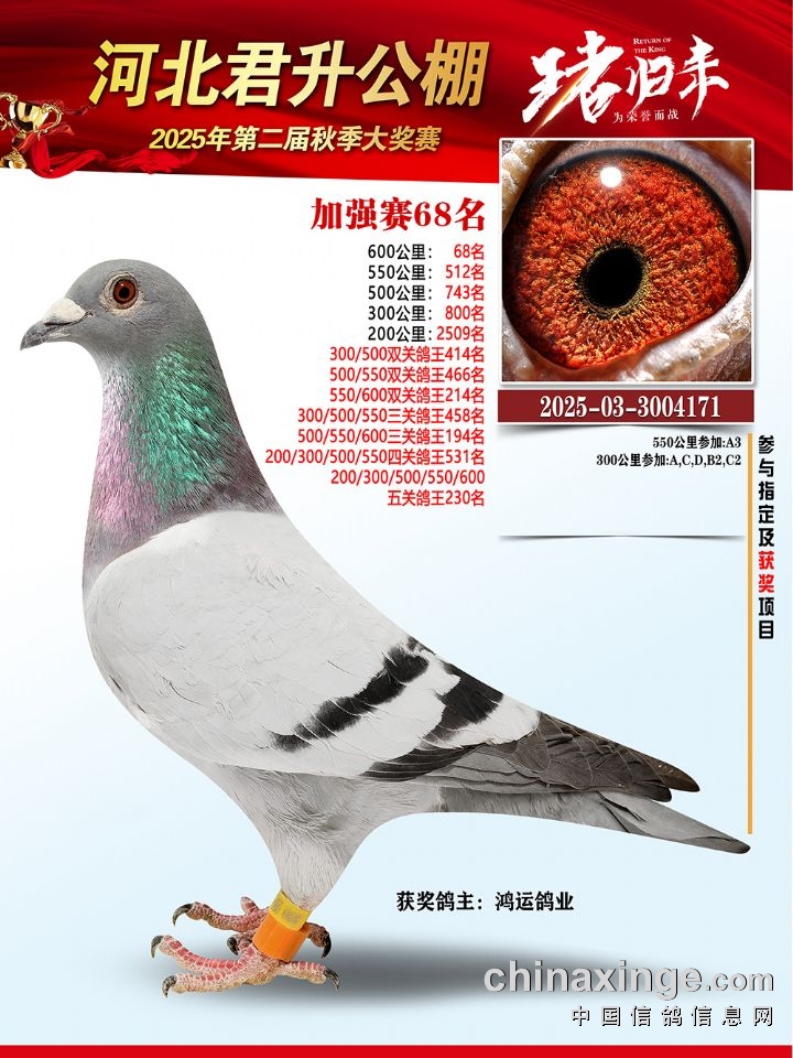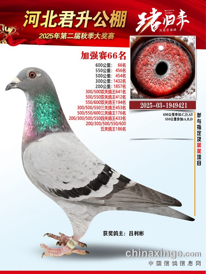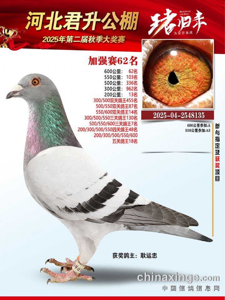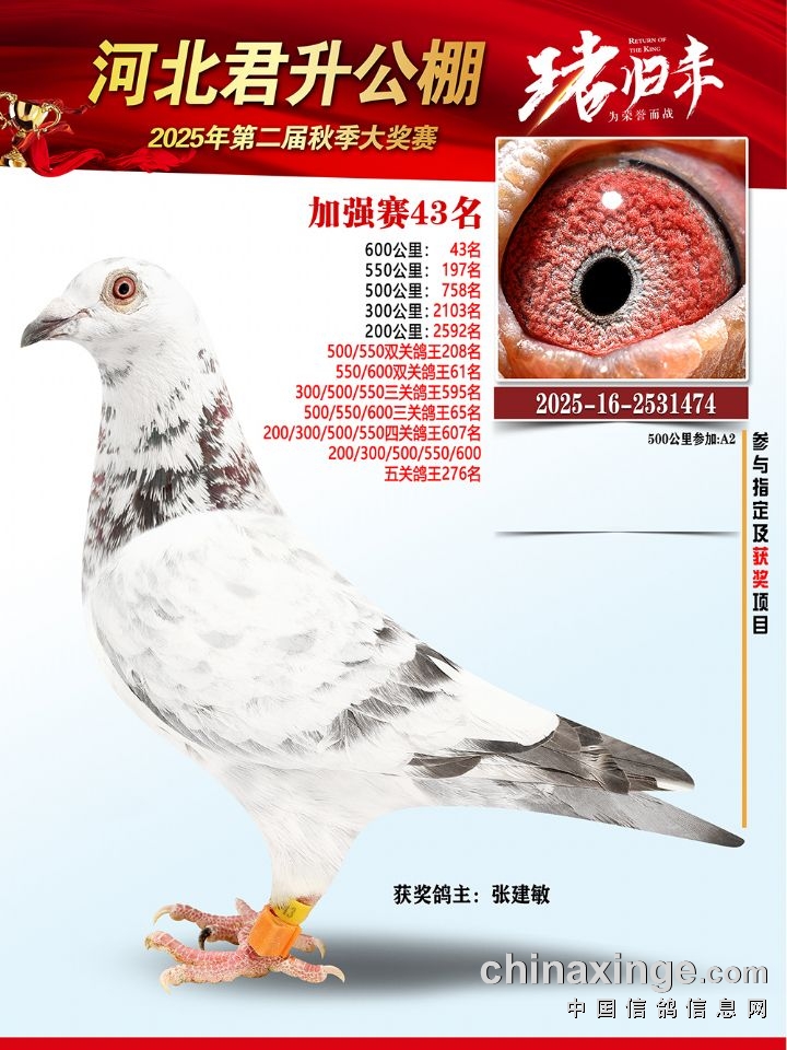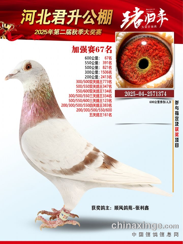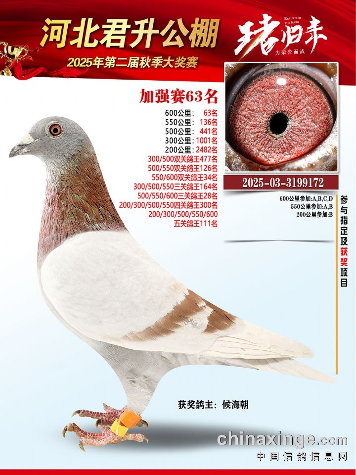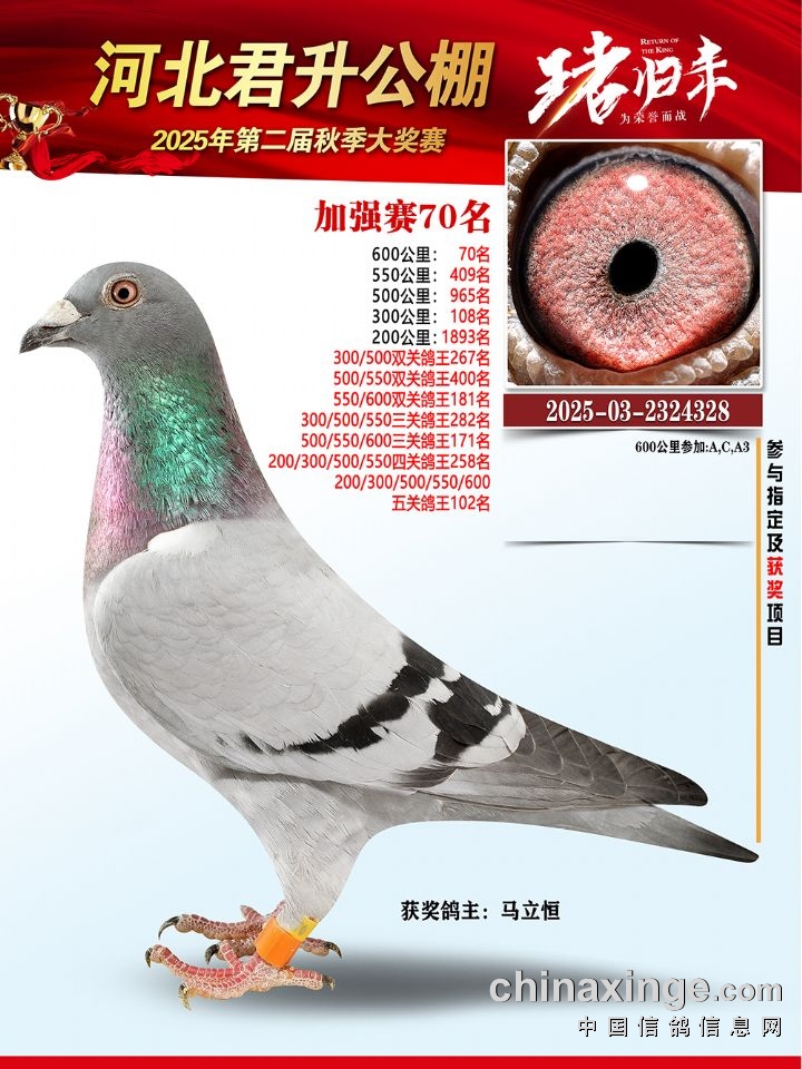 • 河北君升公棚秋赛600公里加强赛冠军-10名获奖鸽照片 (2025-12-19 9:33:57)