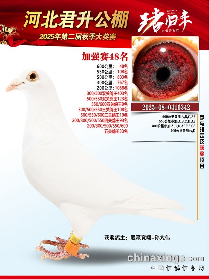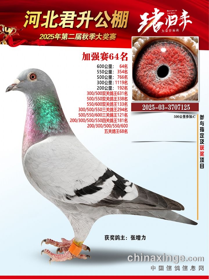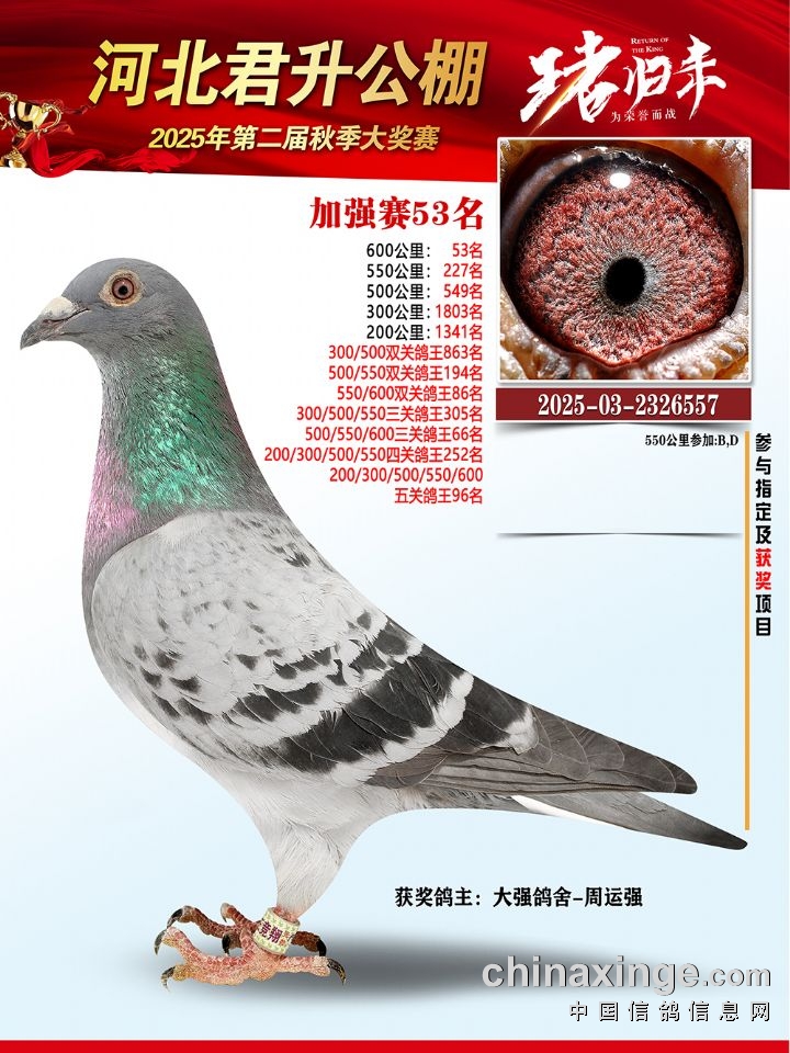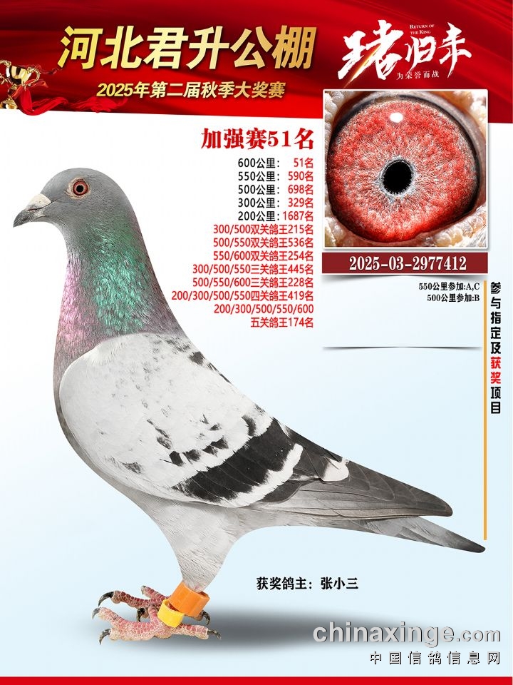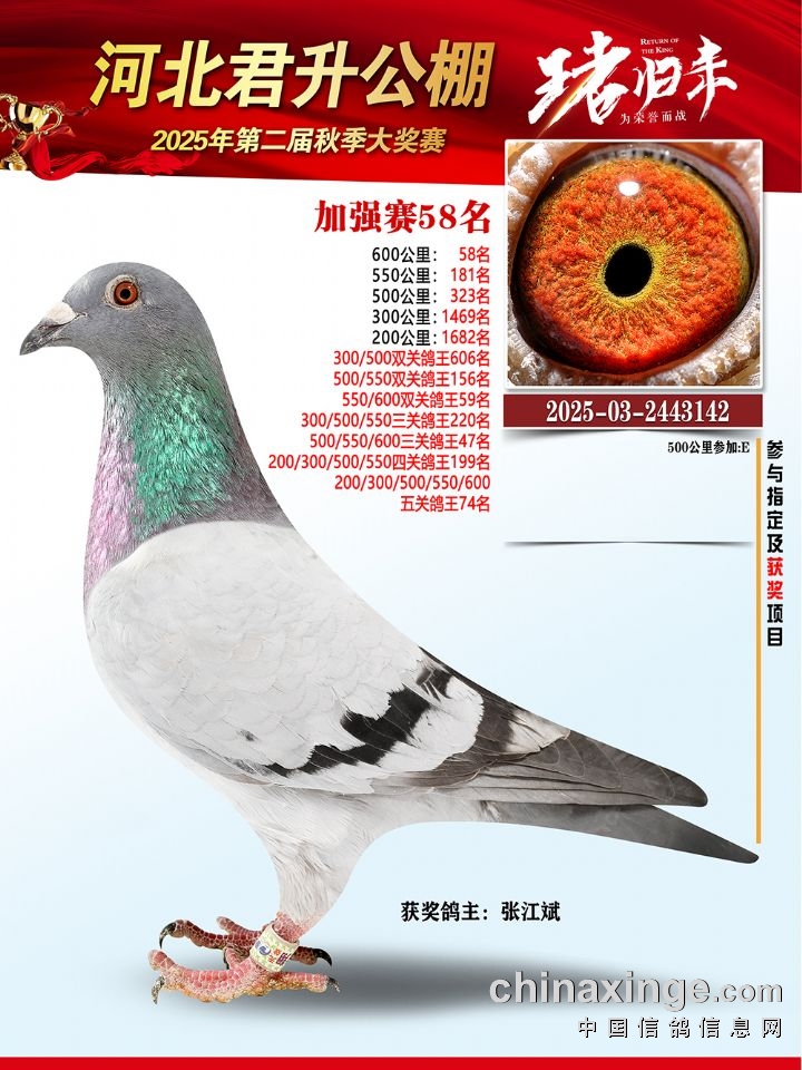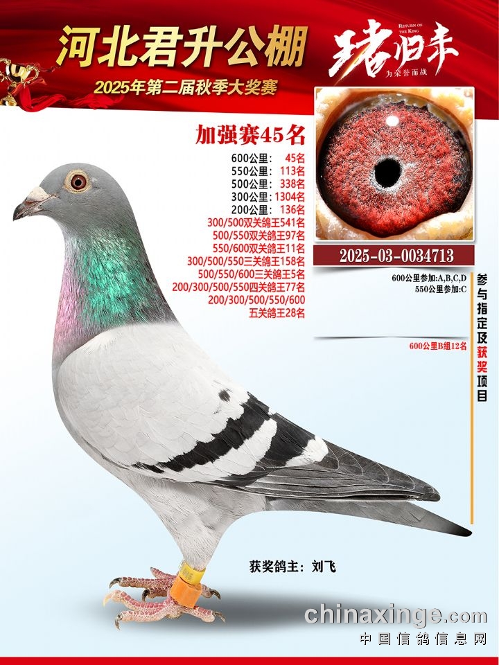• 河北君升公棚秋赛600公里加强赛冠军-10名获奖鸽照片 (2025-12-19 9:33:57)