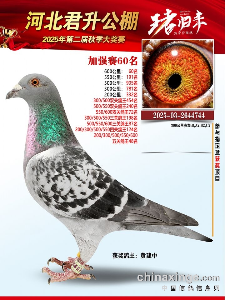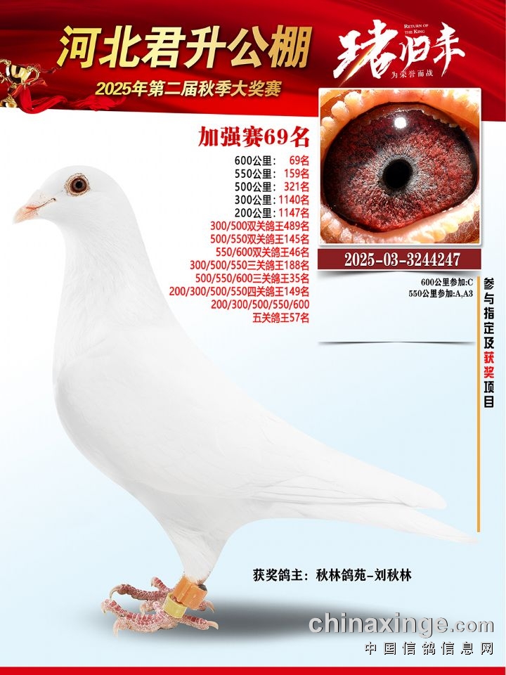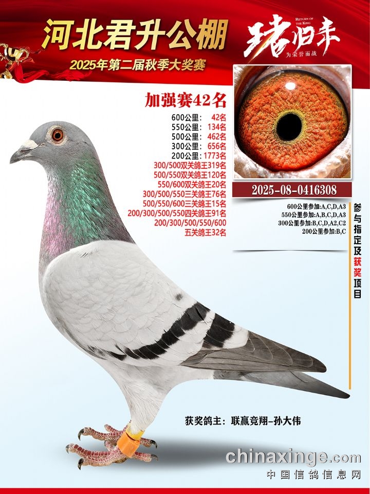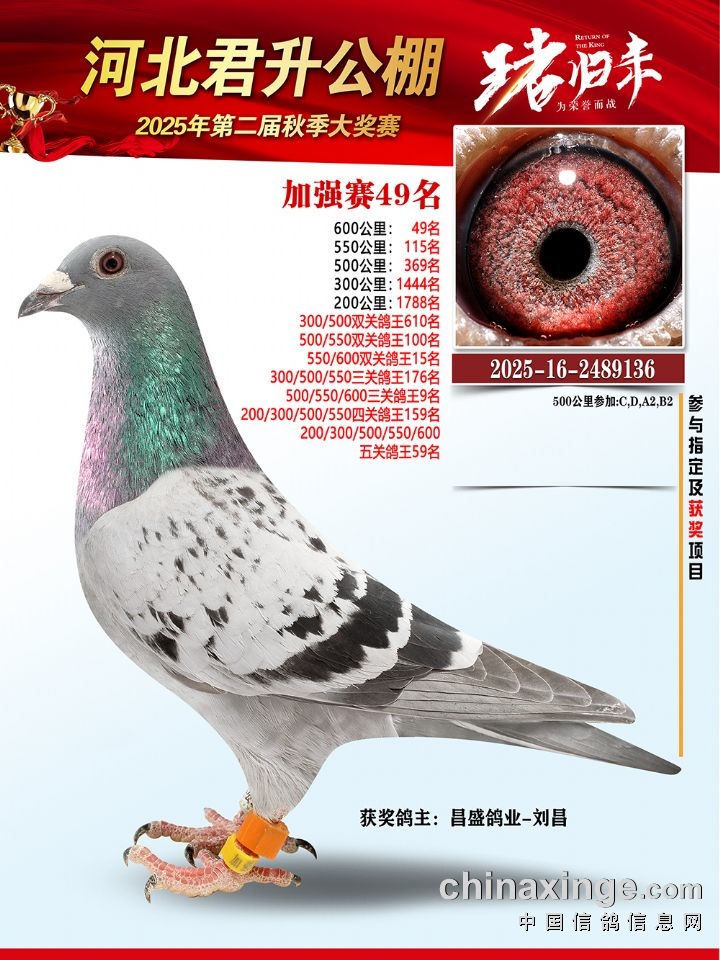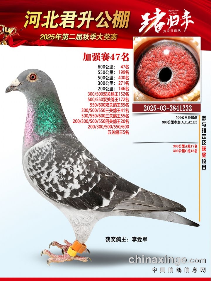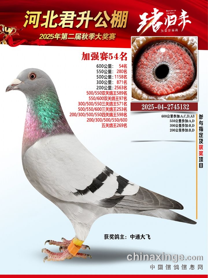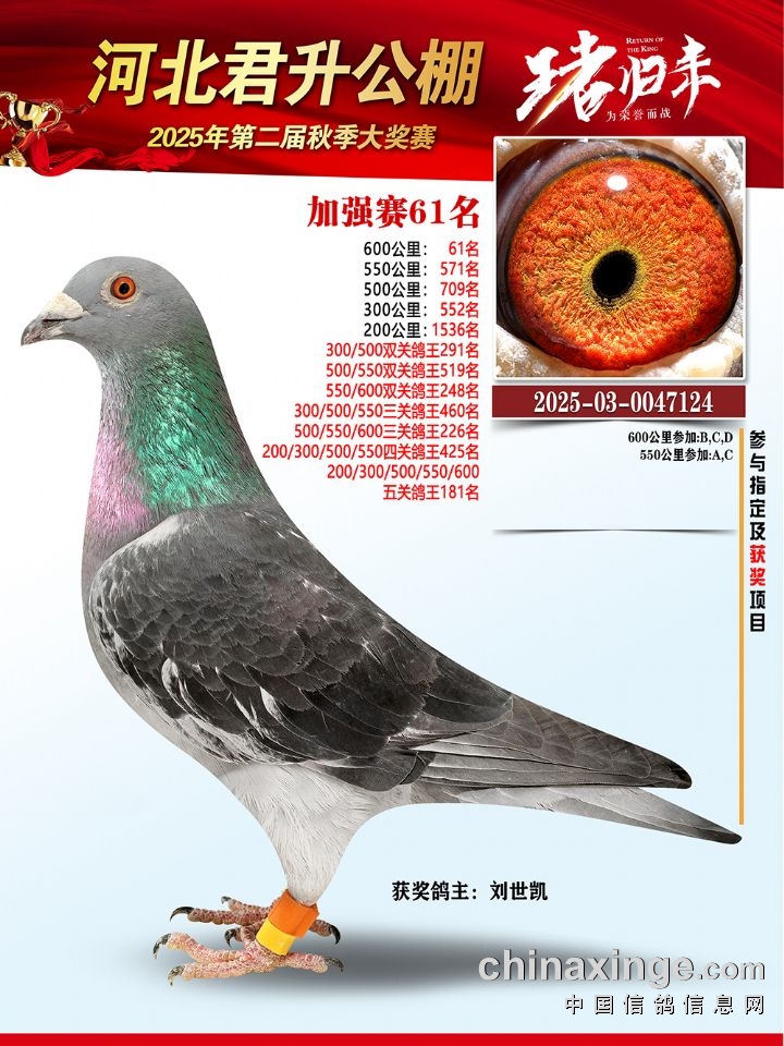 • 河北君升公棚秋赛600公里加强赛冠军-10名获奖鸽照片 (2025-12-19 9:33:57)