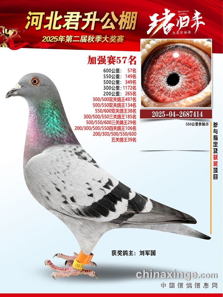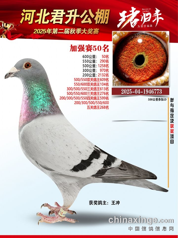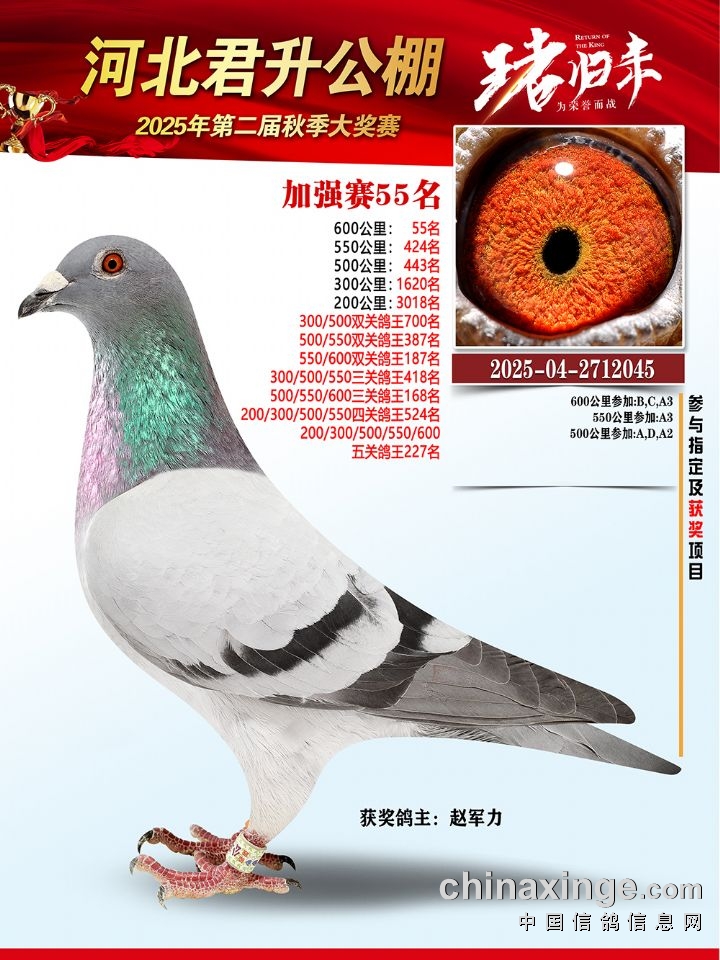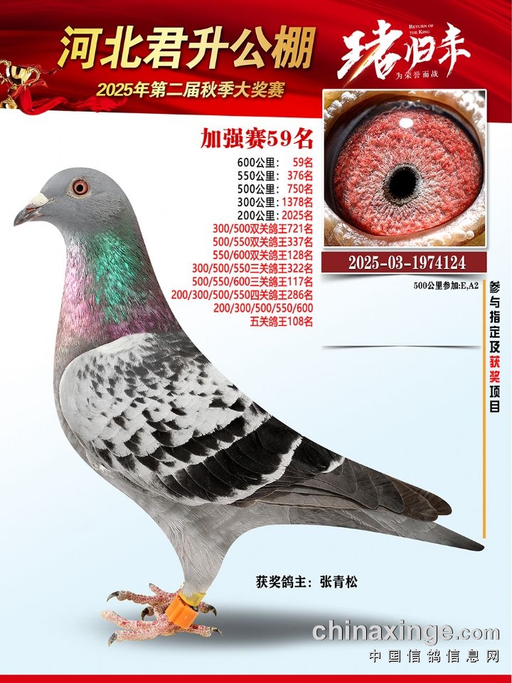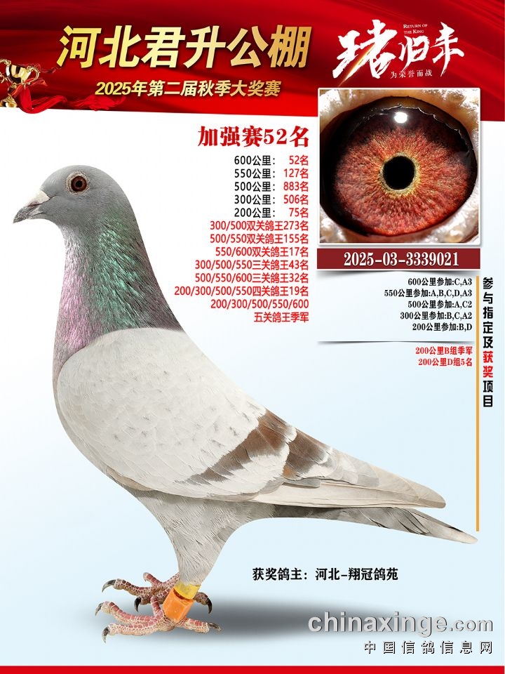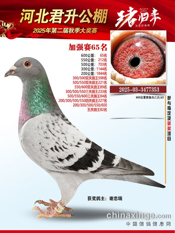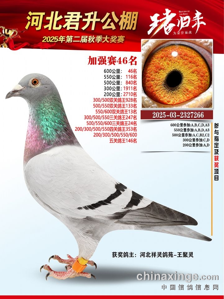 • 河北君升公棚秋赛600公里加强赛冠军-10名获奖鸽照片 (2025-12-19 9:33:57)