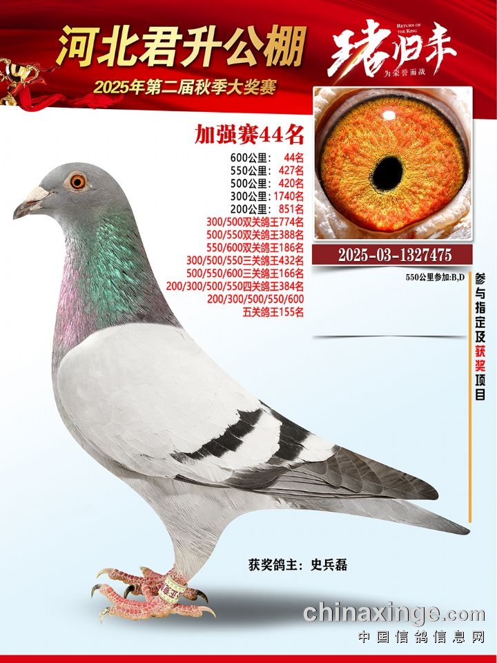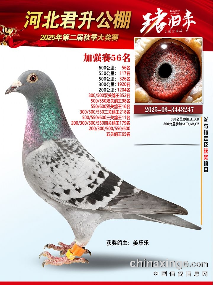 • 河北君升公棚秋赛550公里加站赛冠军-10名获奖鸽照片 (2025-12-16 9:12:48)