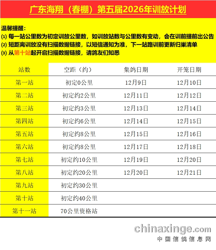 广东海翔(春棚)第八站20公里训放定于2025年12月20日晚集鸽,21日早上开笼!如遇恶劣天气,则改期另行通知!