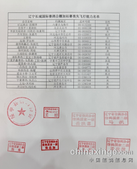 辽宁长城国际赛鸽公棚加站赛丧失飞行能力赛鸽名单
