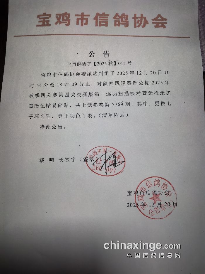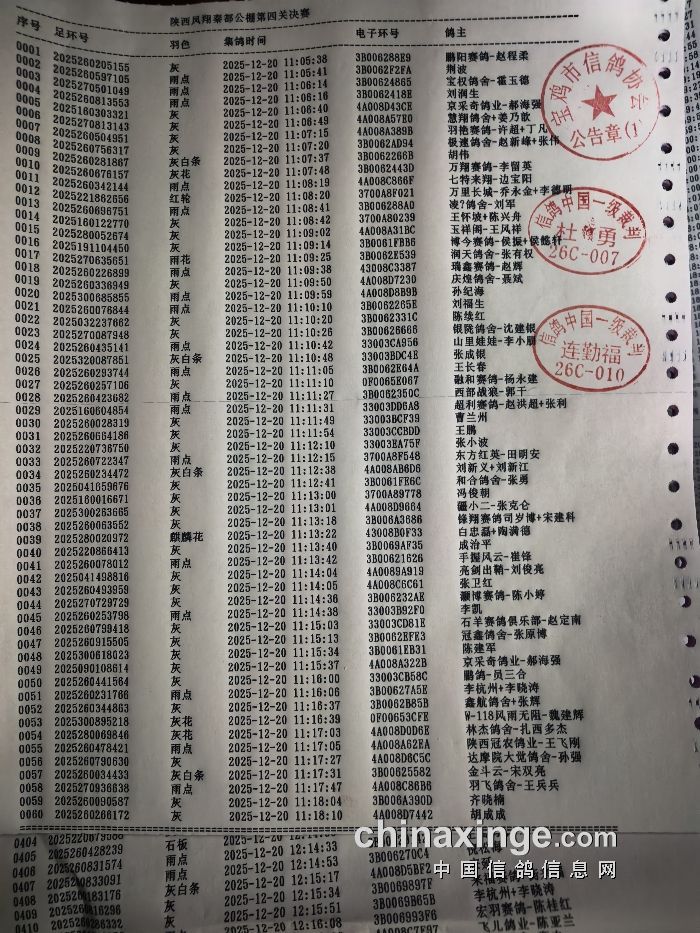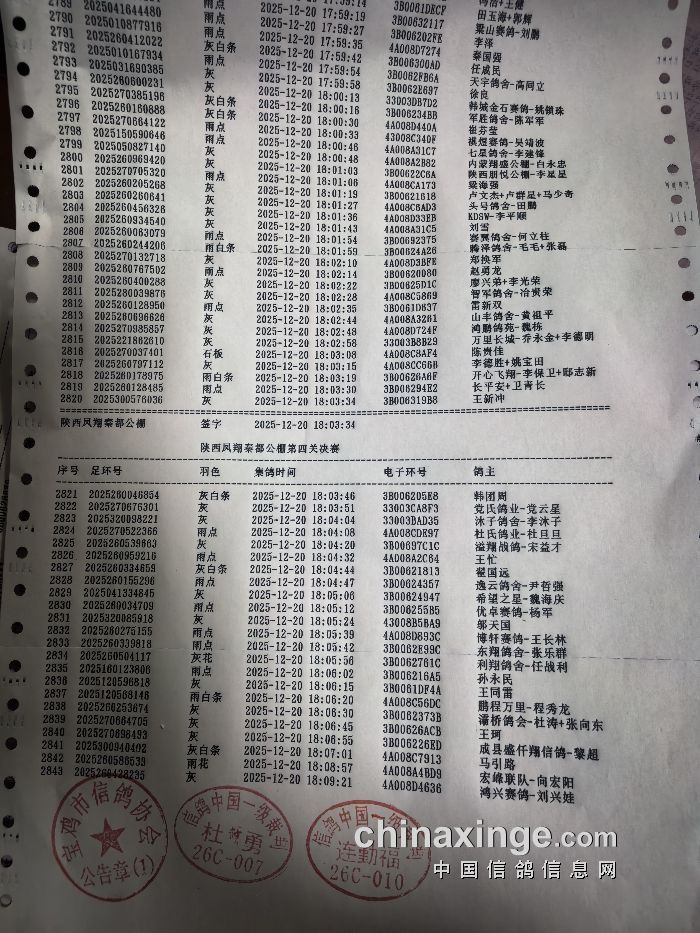 陕西凤翔秦都公棚第三关比赛第四日归巢清单
