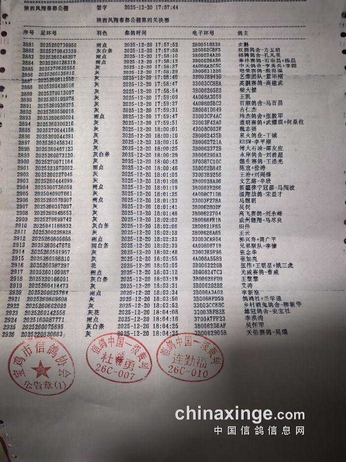 陕西凤翔秦都公棚第四关决赛集鸽数据