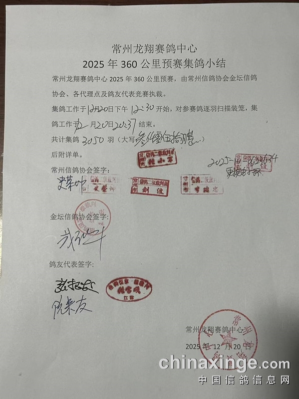 常州龙翔:2025年第三关360公里集鸽数据(按鸽主)