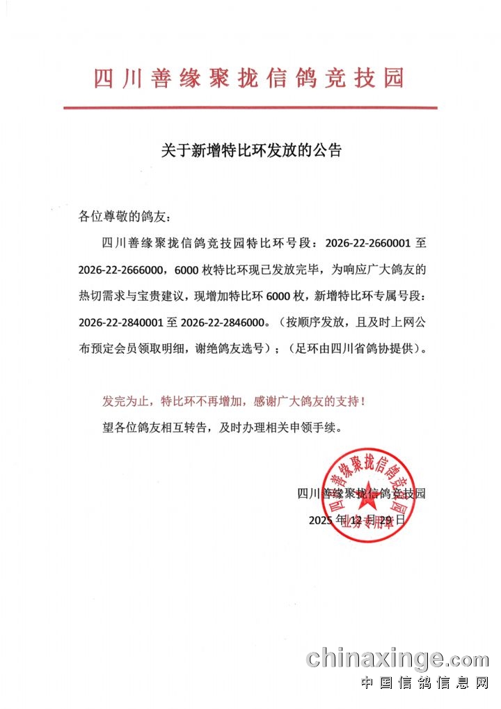 四川善缘聚拢信鸽竞技园特比环赛规程公告