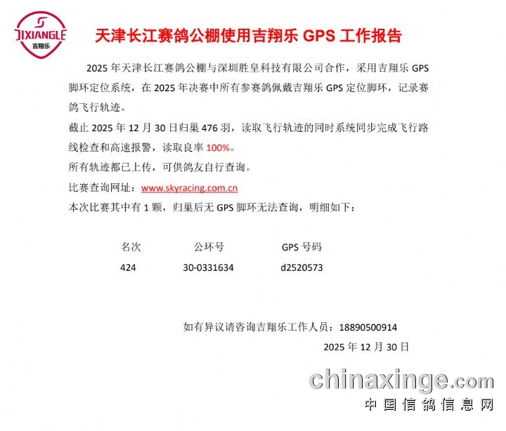 天津长江赛鸽公棚483公里决赛使用吉翔乐 GPS 工作报告