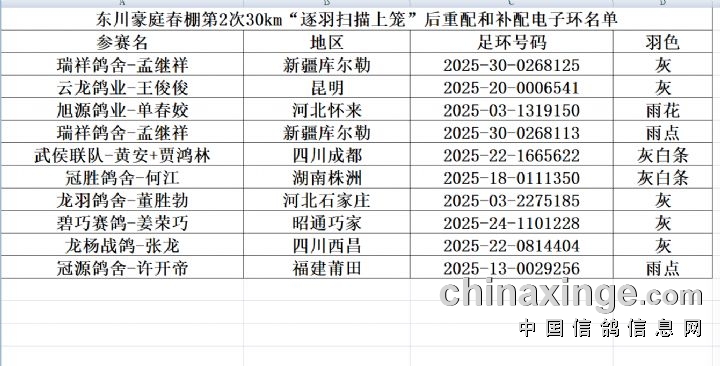东川豪庭春棚第2次30km训放“逐羽扫描上笼”后重配和补配电子环名单