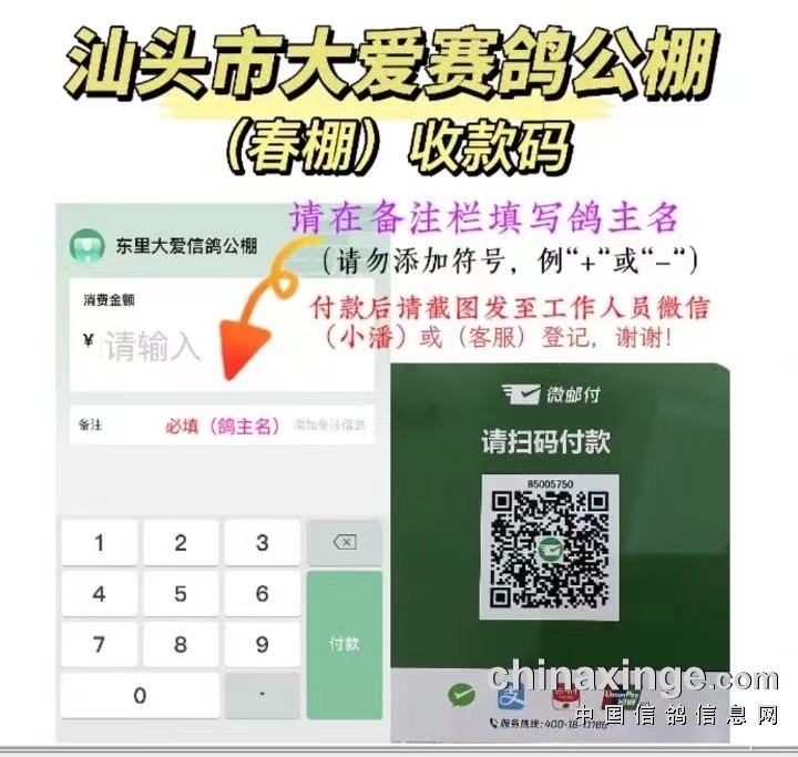 交费人员向我棚公布的银行汇款交费后,将参赛者(鸽主)姓名、交费内容填写清楚,与银行汇款凭证截图或拍照微信发至: