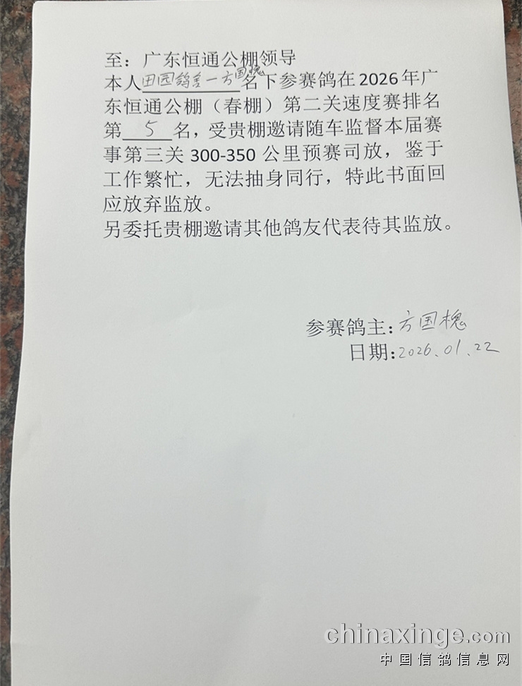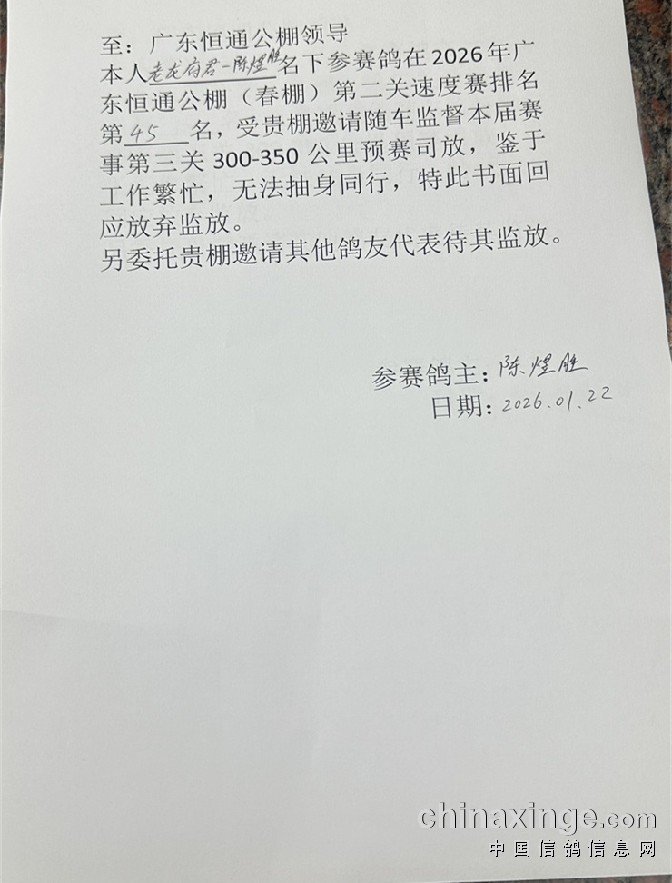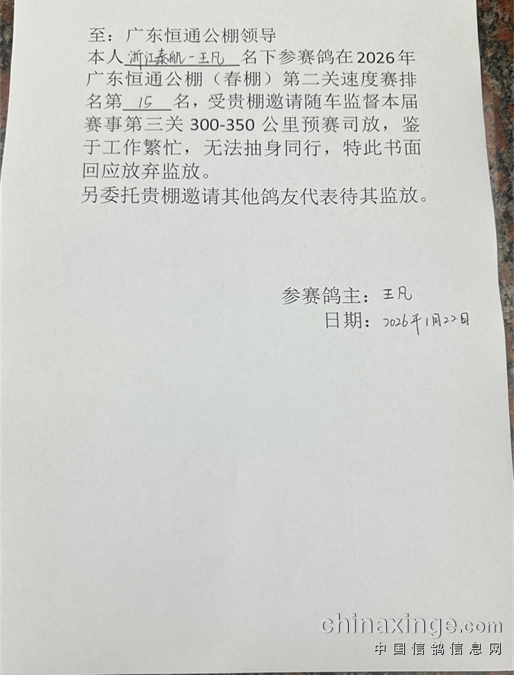 广东恒通(春棚)2026年第四届第三关300-350公里预赛定于1月23日晚集鸽,1月24日早上开笼比赛!司放地:福建省莆田市涵江区,届时由广东省信鸽协会委派裁判长及潮州市信鸽协会裁判组进行逐羽扫描、核对足环号、加盖暗章、邀请福建省信鸽协会委派监放全过程等工作;届时集鸽过程,开笼,归巢会进行快手网络视频直播!