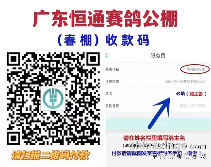 请扫描以下二维码,填写支付金额,并在“备注”里填写清楚鸽主参赛名,付款成功后截图发给恒通文员:小鹿(18899781666)、春棚财务(18899781999)微信与手机同号;并附加微信说明报名环号、报名组别等!