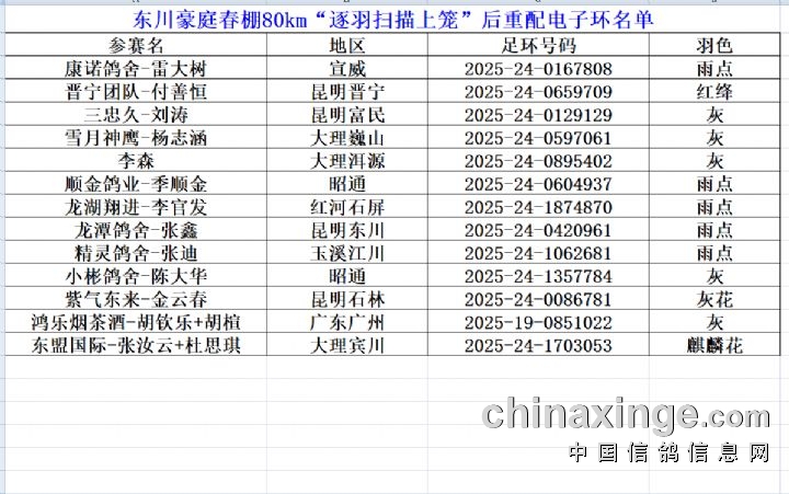 东川豪庭春棚80km“逐羽扫描上笼”后重配电子环名单