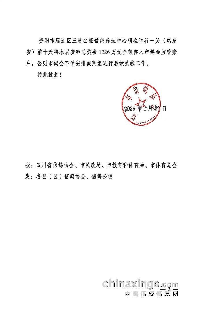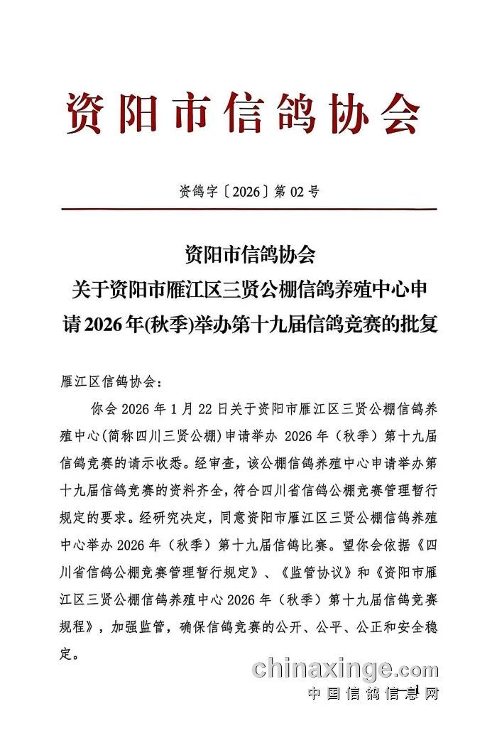 资阳市鸽协关于三贤公棚举办第十九届信鸽竞赛的批复