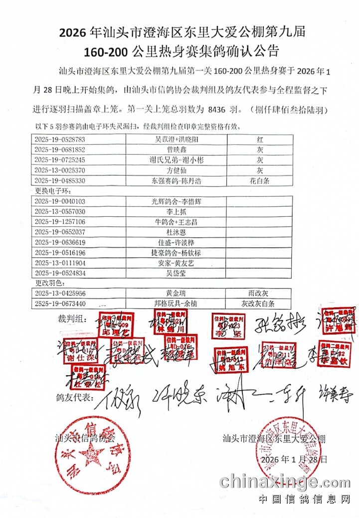 汕头市澄海区东里大爱信鸽公棚(第九届)第一关160-200公里热身赛集鸽上笼清单