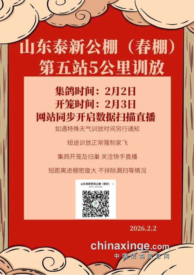 山东泰新赛鸽公棚(春棚)第五站5公里训放公告