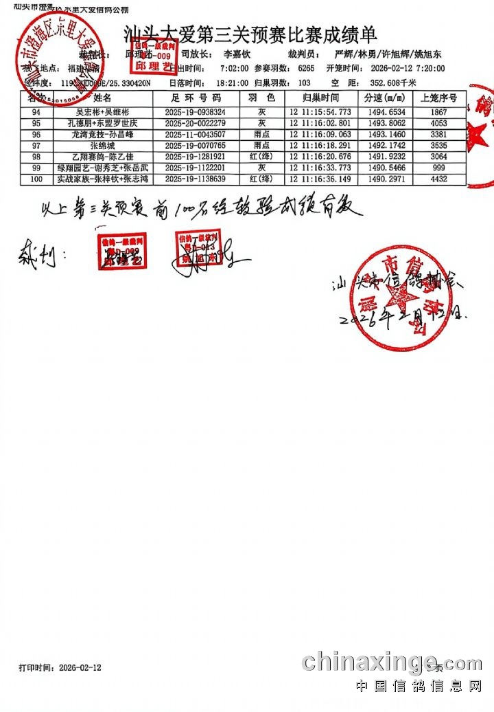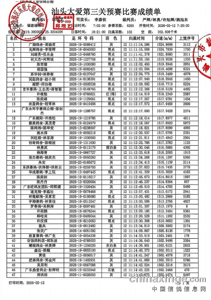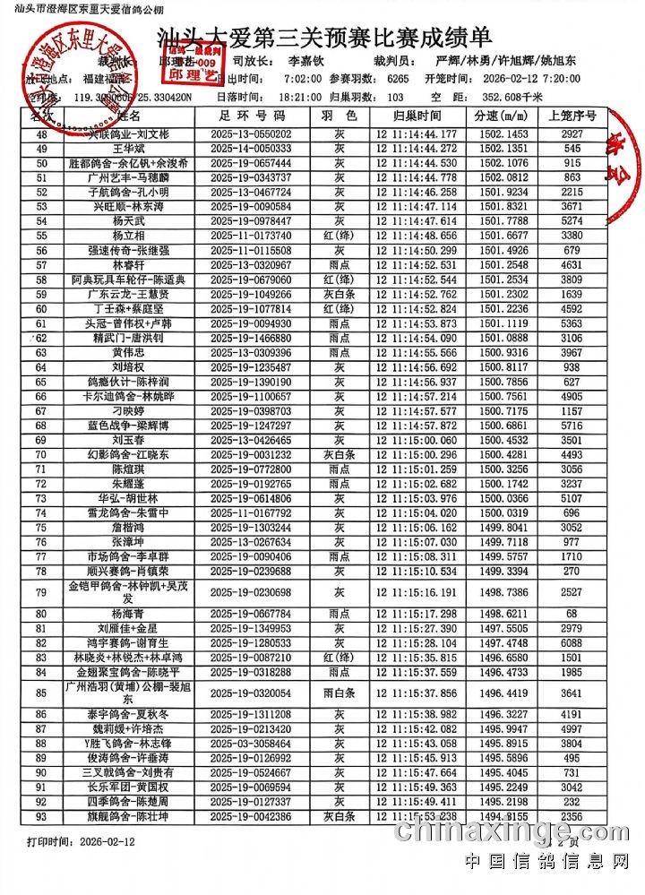 汕头市澄海区东里大爱信鸽公棚(第九届)第三关350-400公里预赛报名成绩单比赛成绩单