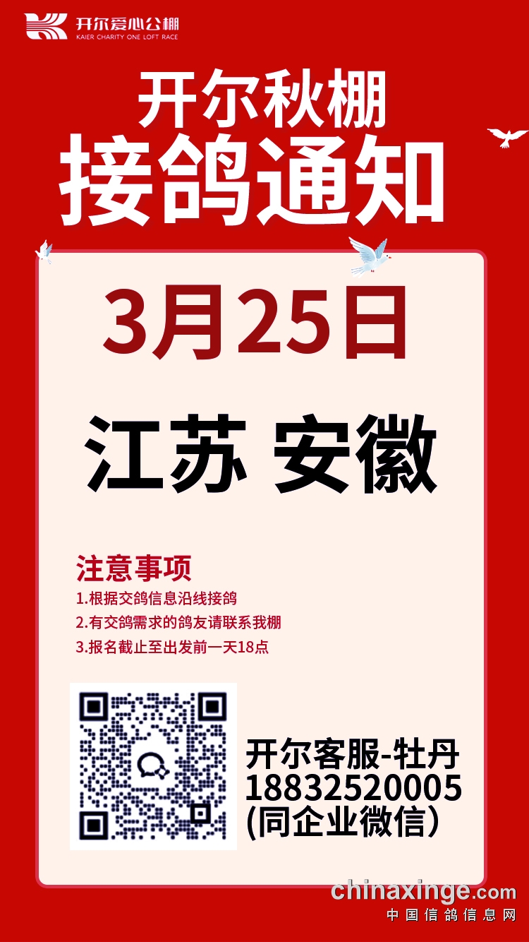 开尔爱心公棚(青年队)3月25日江苏、安徽接鸽通知