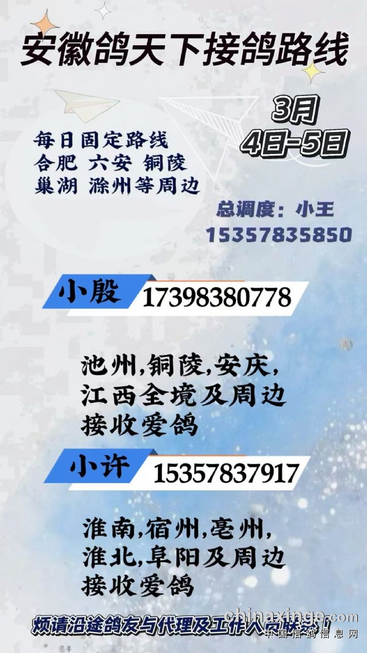 安徽鸽天下3月4日皖北、皖南、江西全境接鸽路线