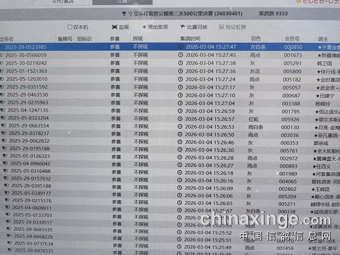 宁夏乐祥赛鸽公棚第三关500公里集鸽明细-按顺序