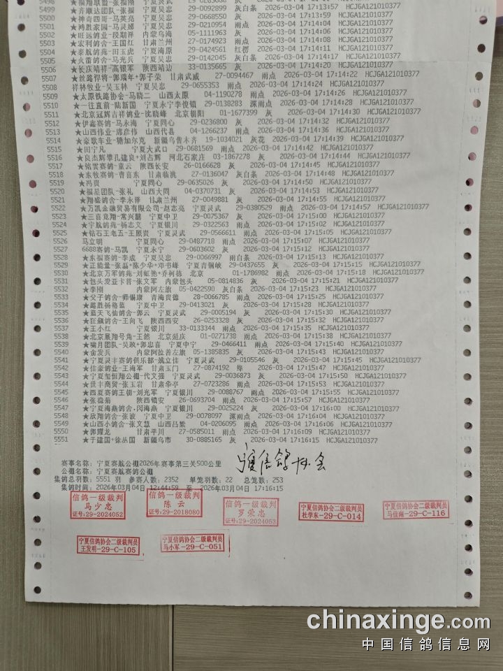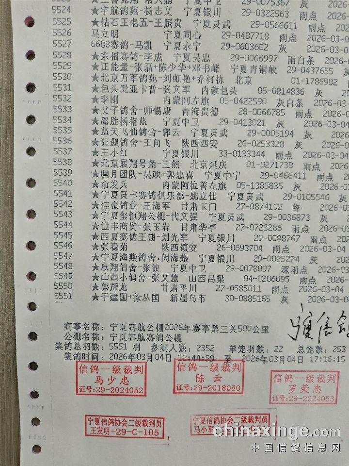 宁夏赛航赛鸽公棚第三关500公里集鸽上笼明细(按顺序)