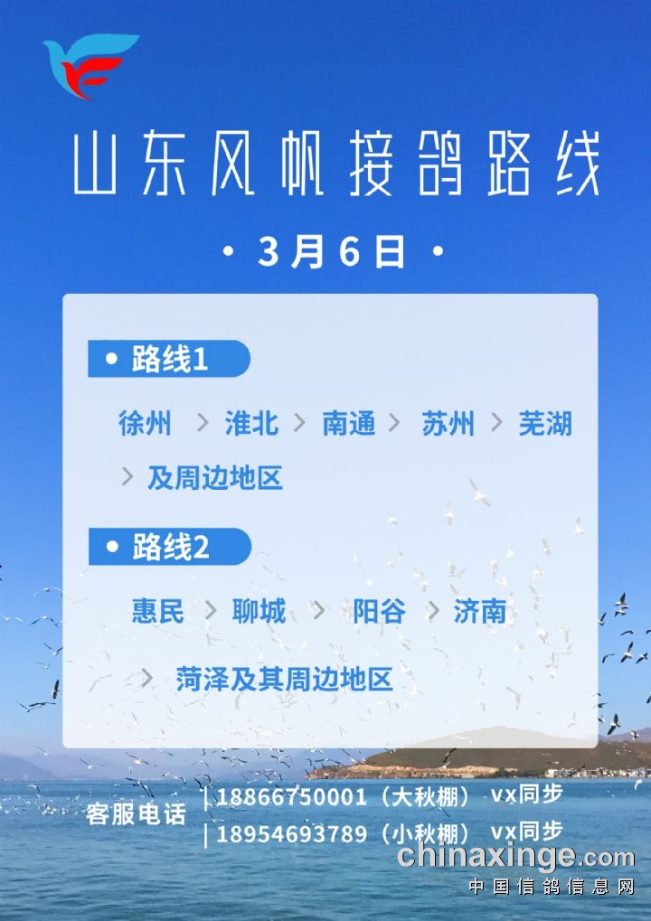 山东风帆赛鸽公棚(小秋棚)03月06日接鸽路线