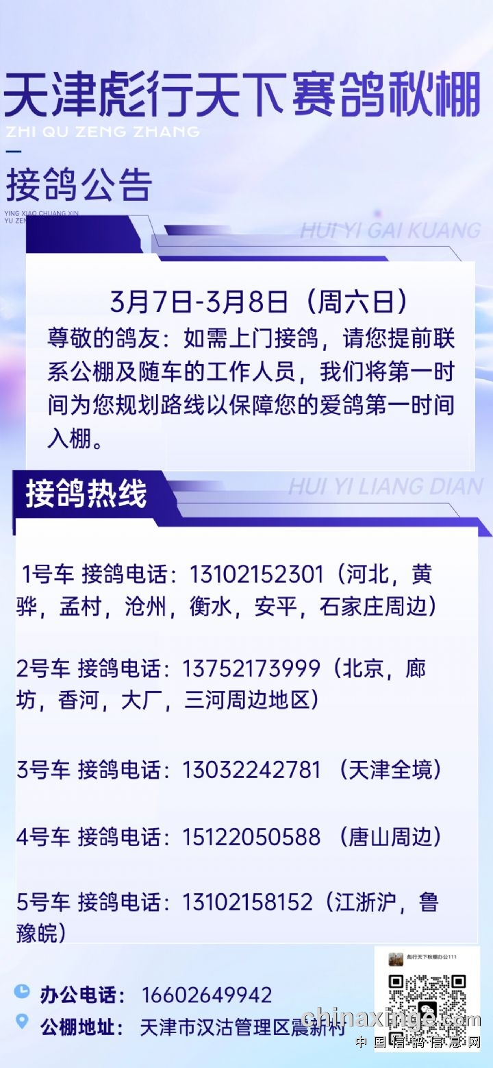 天津彪行天下赛鸽公棚3月7日-3月8日(本周六)上门接鸽
