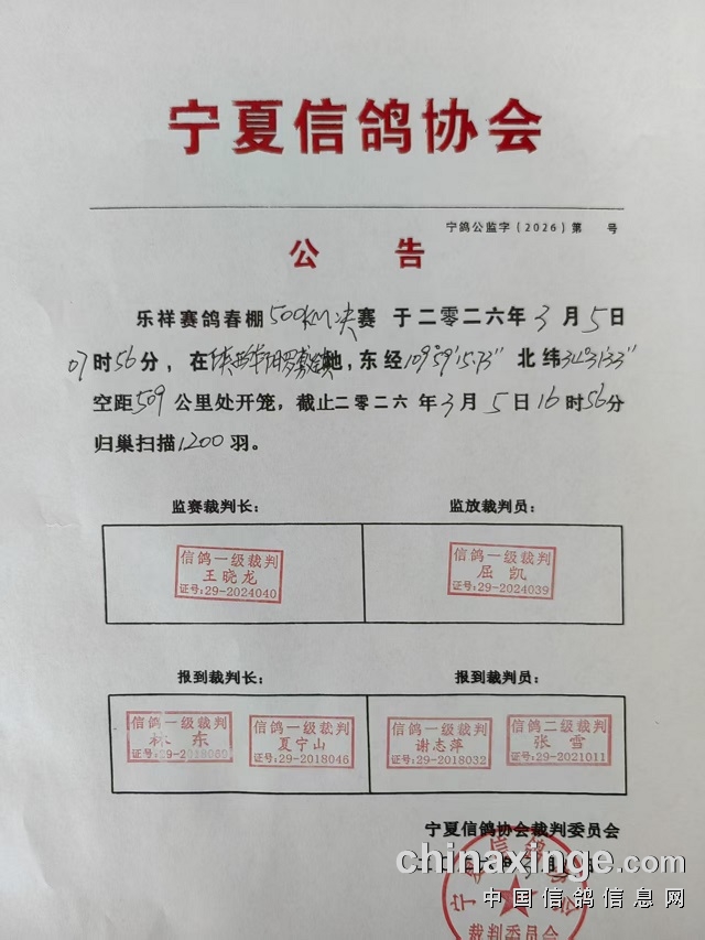 宁夏乐祥赛鸽公棚第三关500公里决赛开笼通知