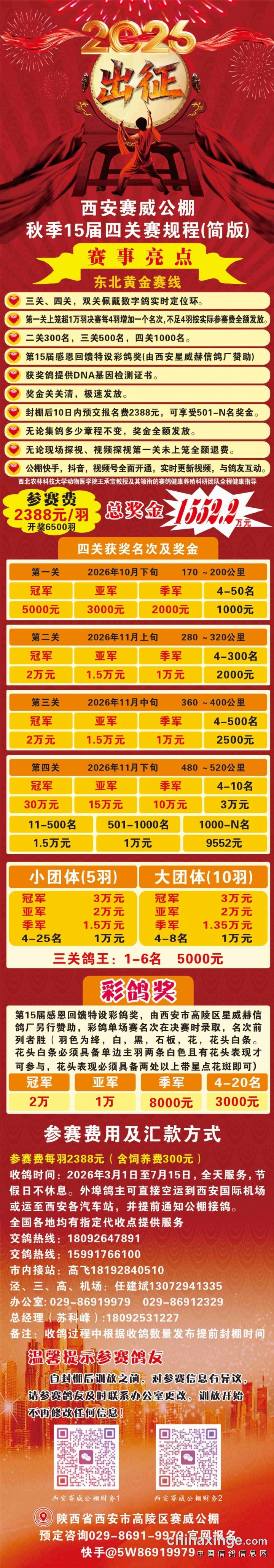 西安赛威公棚2026年收鸽清单(更新中.....)