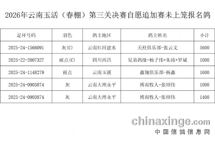 云南玉活(春棚):第三关自愿追加赛未上笼报名鸽