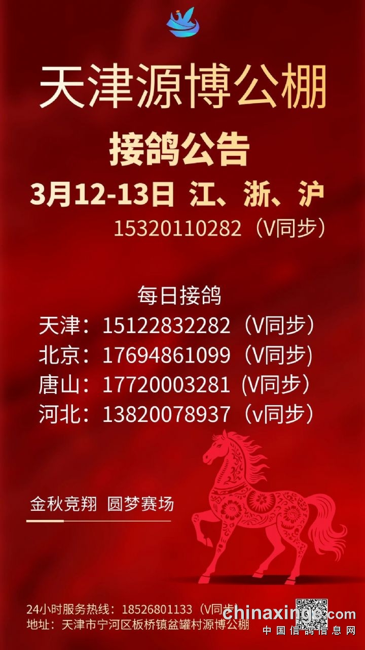 • 天津源博公棚3月4日河北、山东全境接鸽公告 (2026-2-28 15:08:44)