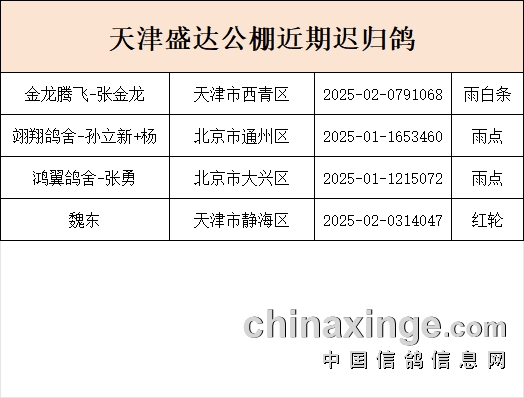 天津盛达赛鸽公棚近期迟归鸽