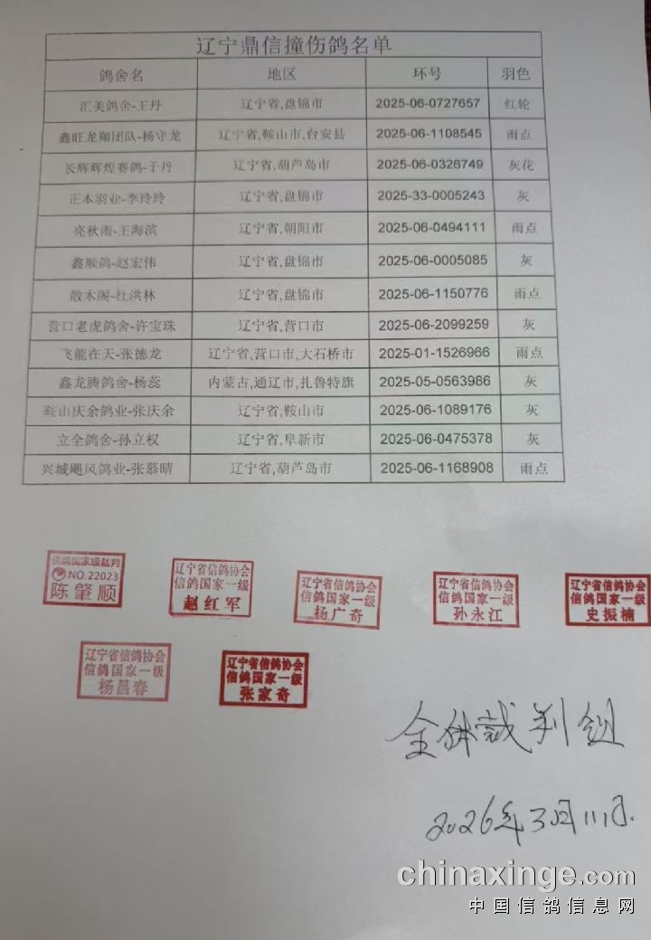 辽宁鼎信春棚:第十一次60公里训放扫描数据清单(不排除漏扫,游棚和电子环损坏)