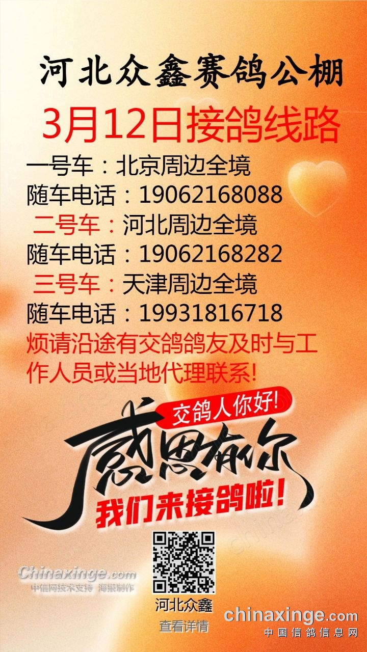 河北众鑫赛鸽公棚 3月12日接鸽线路
