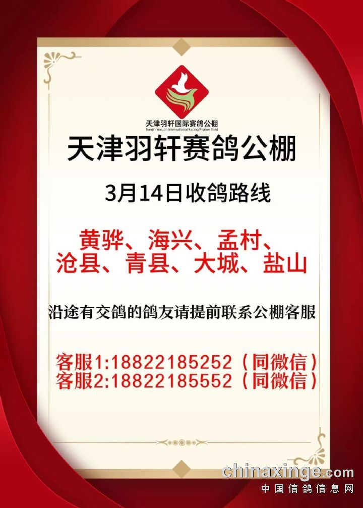 天津羽轩赛鸽公棚3月14日收鸽路线
