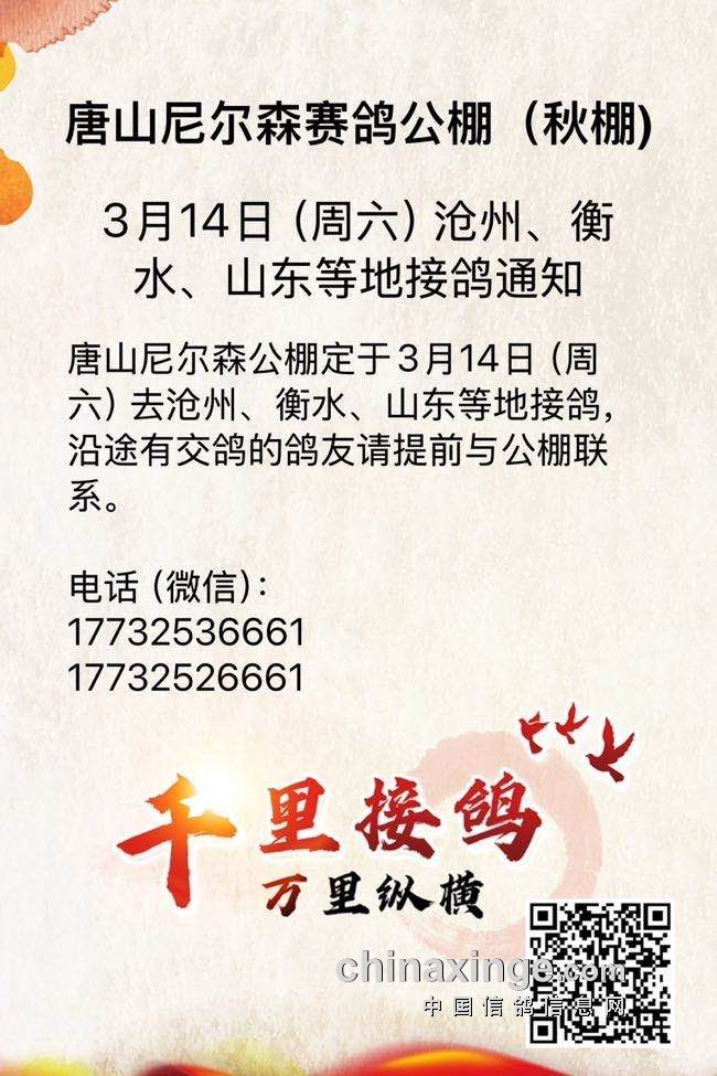 唐山尼尔森公棚3月14日(周六)沧州衡水山东接鸽通知