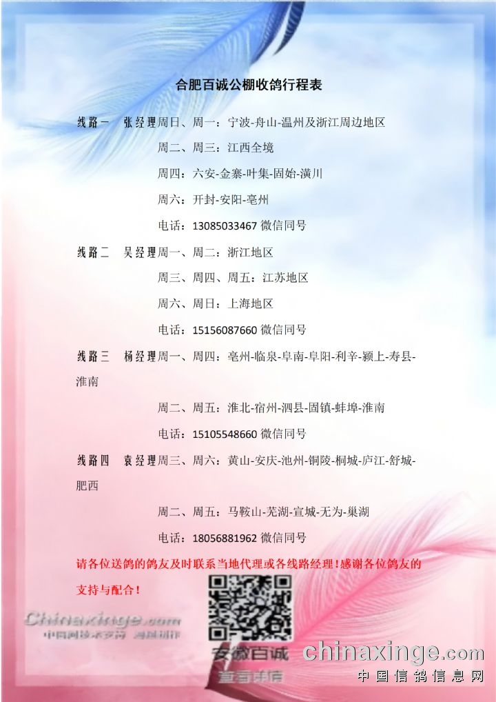 安徽百诚赛鸽中心:3月14日接鸽路线