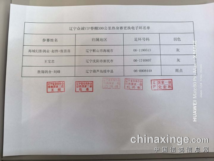 辽宁众诚VIP春棚300公里热身赛更改羽色名单