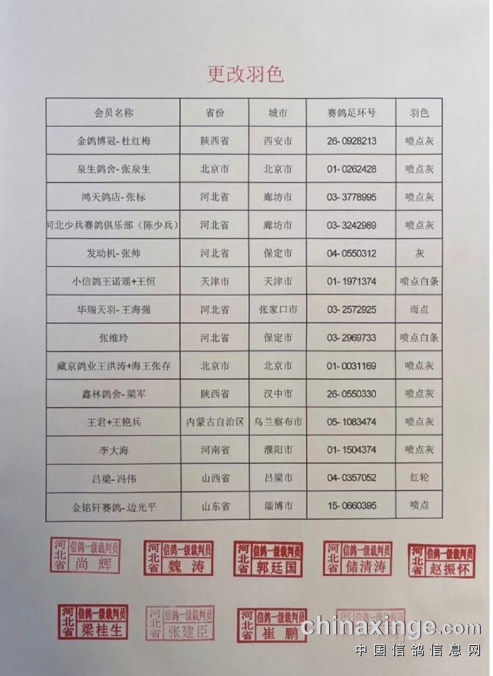 河北久盟国际赛鸽公棚(小春棚)热身赛逐羽集鸽清单