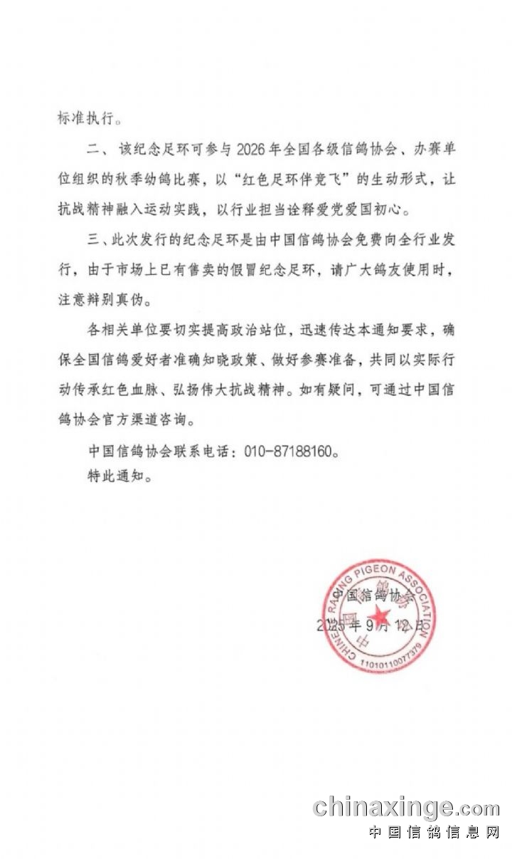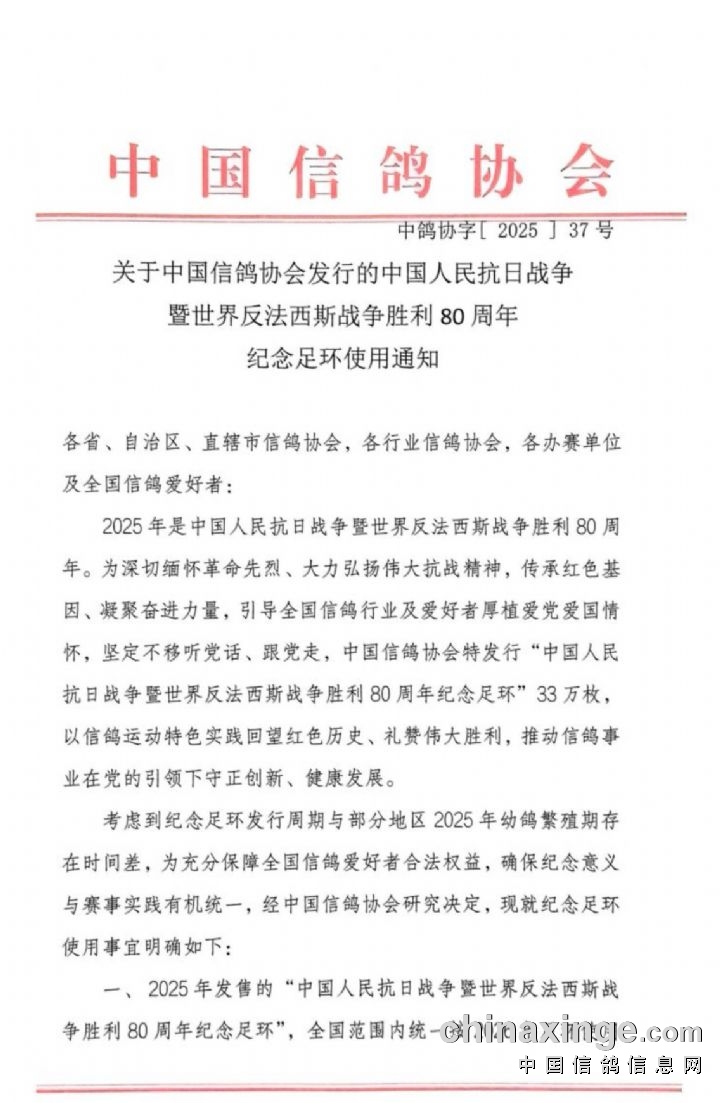 《关于中国信鸽协会发行的中国人民抗日战争暨世界反法西斯战争胜利80周年纪念足环使用通知》